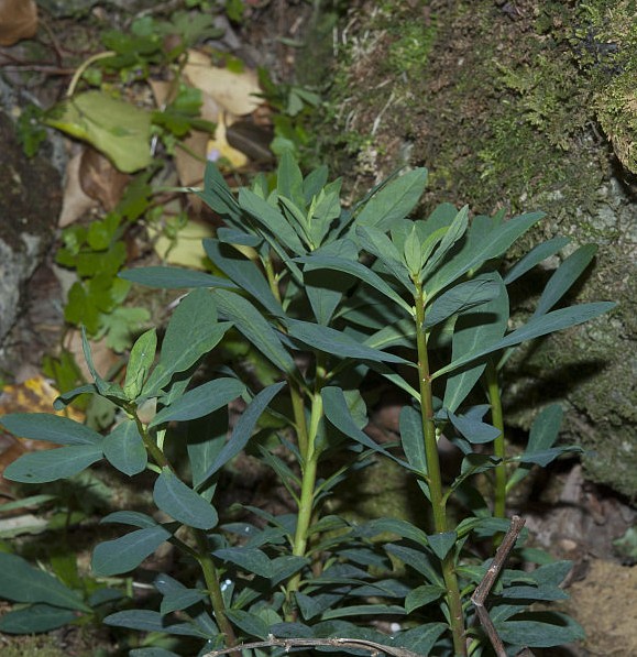 Korsika Cyathie 1,2 - 1,9 mm lang, 1,1 - 1,6 mm breit, Samen 1,5 mm - 1,9 mm lang Blätter lanzettlich, +/- gleich groß und im gleichen Abstand stehend > Euphorbia semiperfoliata |