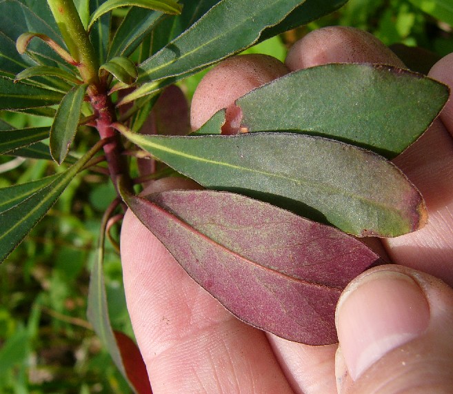 Samen eiförmig, 3 - 3,5 mm lang, glatt, grau, Anhängsel klein Alte Blätter unterhalb der neuen Blätter rosettig gehäuft, größer die diesjährigen Junge Blätter oberseits kahl und glänzend Ältere Blätter ledrig, eilanzettlich, 30 - 80 mm lang,