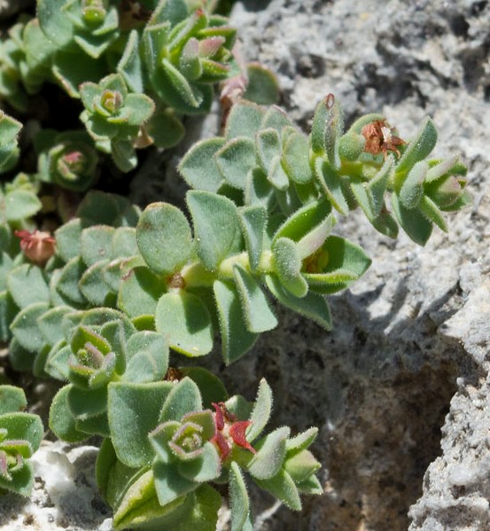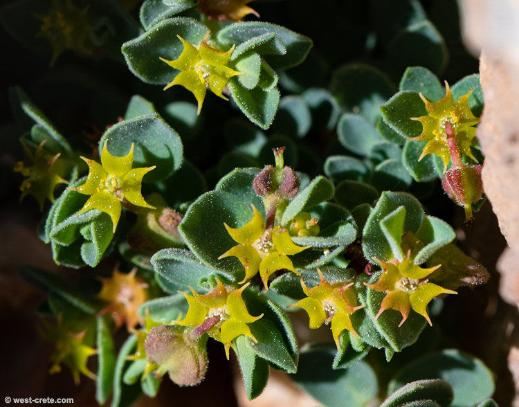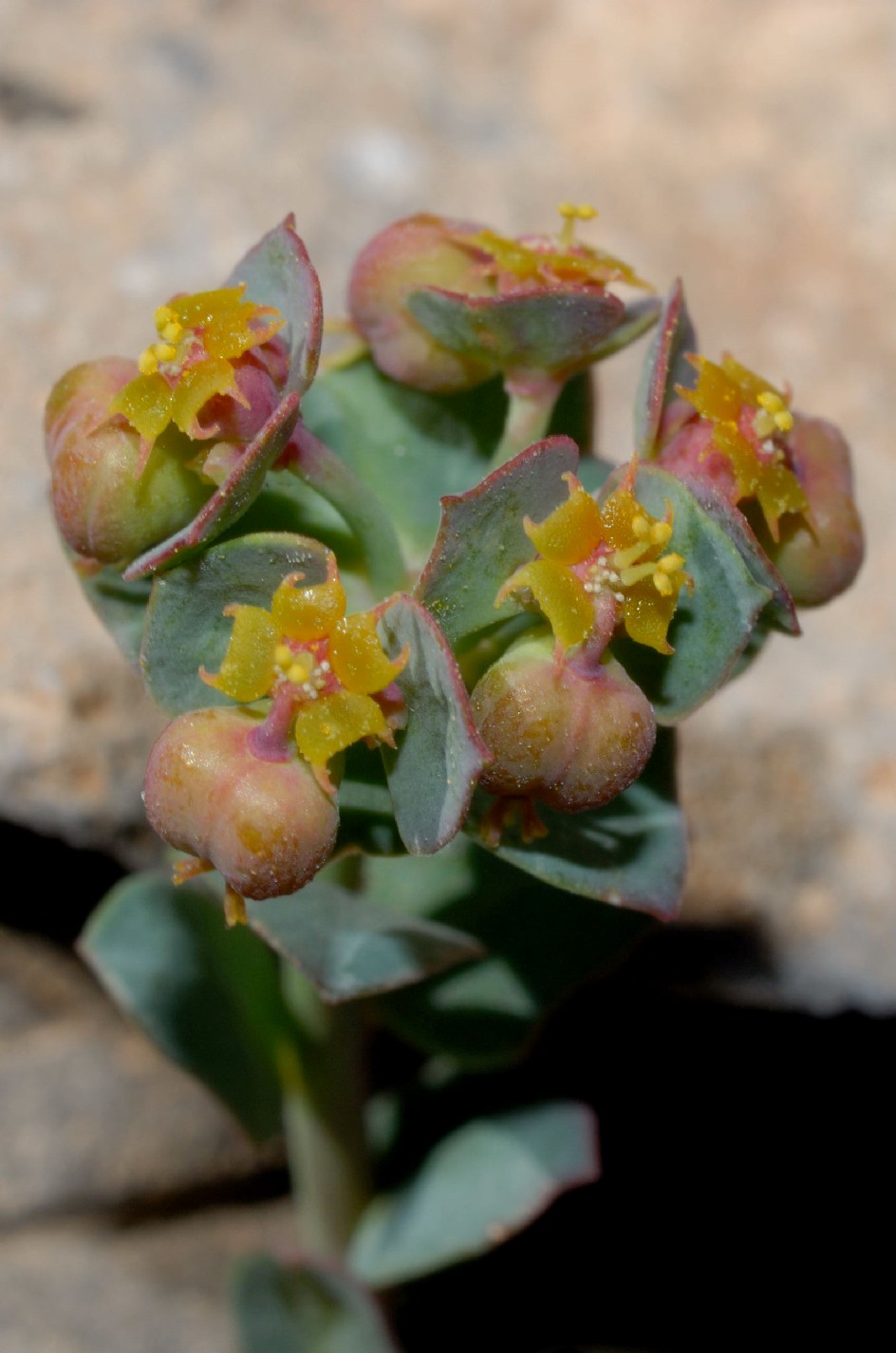 Tragblätter der Cyatien breit elliptisch, 5 - 8 mm lang, 7 - 12 mm breit, blaugrün, nicht miteinander verwachsen, stumpf, manchmal ausgerandet, Drüsenanhängsel gelb halbmondförmig, mit langen Hörnchen, Kapsel 3,5 - 5 mm lang, glatt, kahl, nicht geflügelt