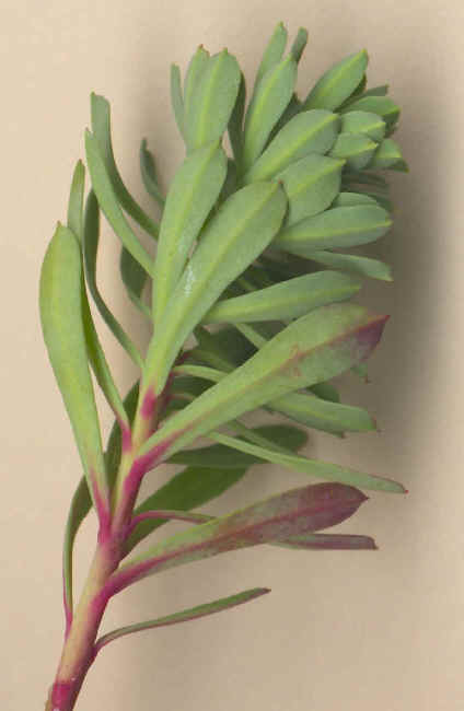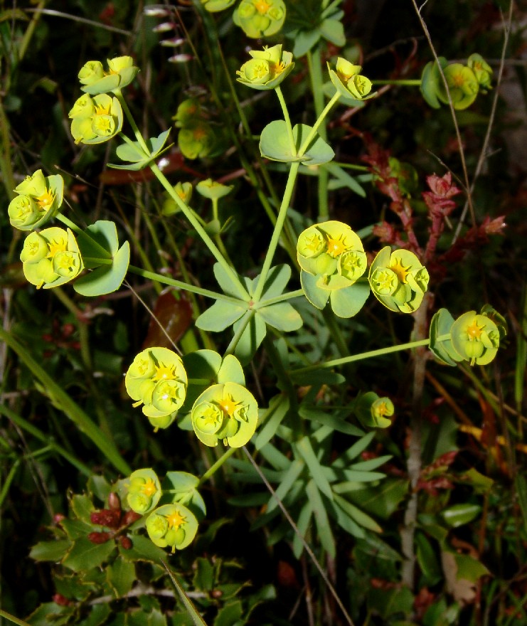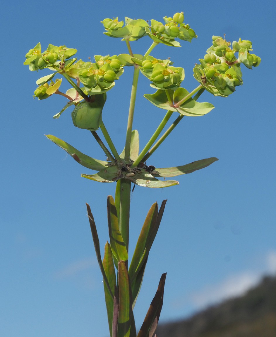 Euphorbia - Pflanze krautig, Stängelblätter blaugrün, 3 - 10 mm breit, Scheindolde mit 3 - 5 Doldenstrahlen, Drüsenanhänge halbmondförmig, mit langen Hörnchen, Hüllchenblätter getrennt, Kapsel warzig