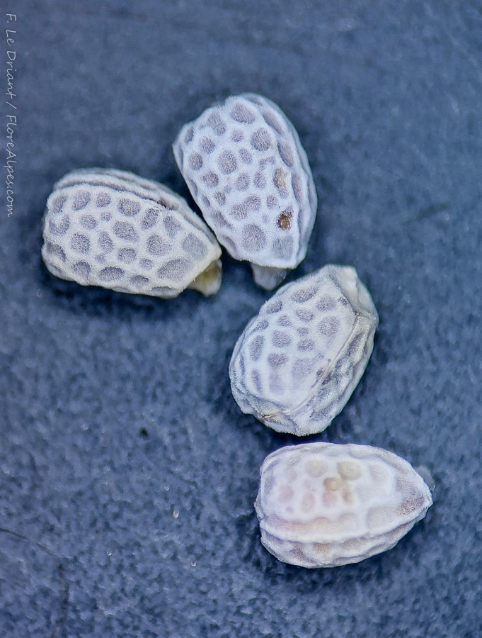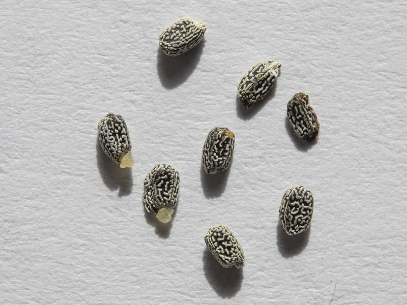 Samen 1,8 - 2 mm lang, elliptisch, hellgrau, wabig, mit +/- tiefen, dunkelgrauen Gruben