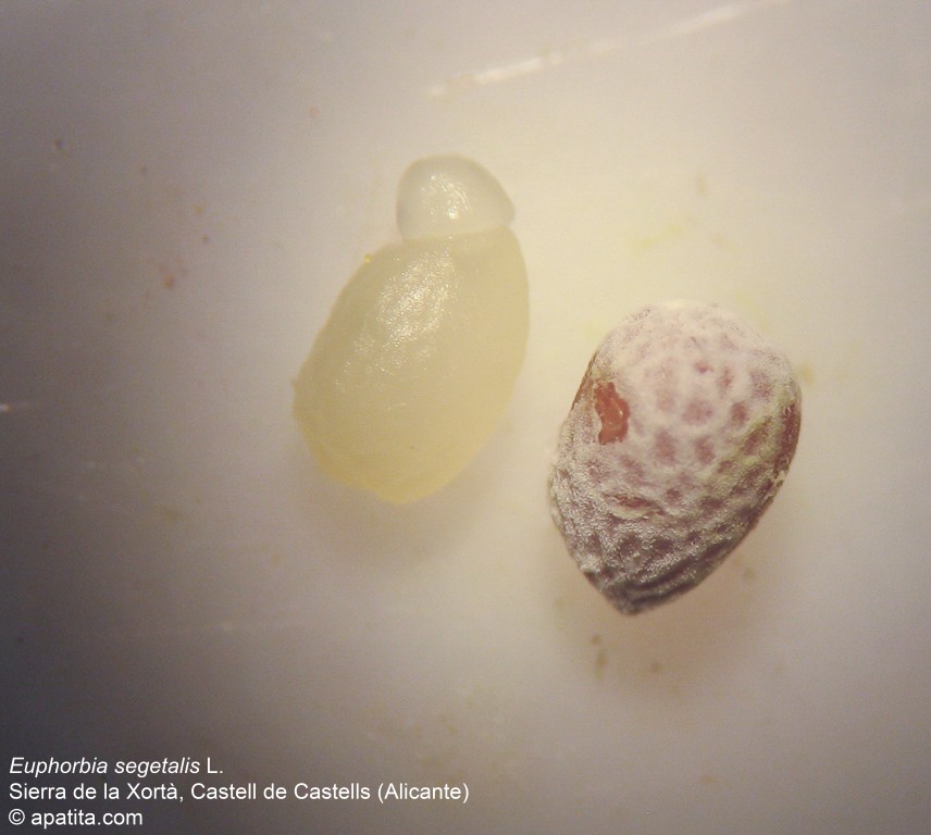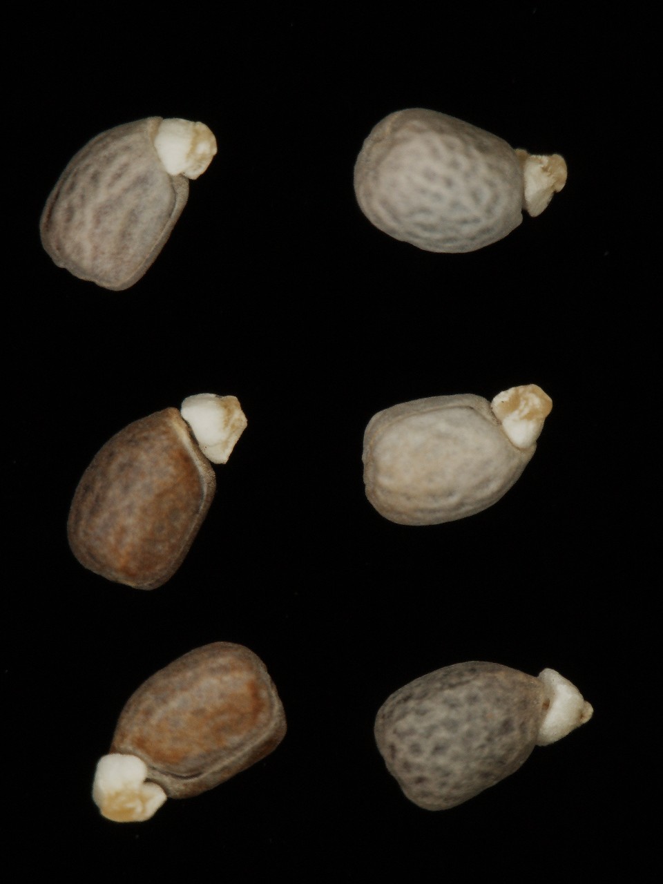 Samen 2 - 2,3 mm lang, 1,3 - 1,5 mm breit, eiförmig, am Grund gestutzt, hellgrau, Oberfläche wabig