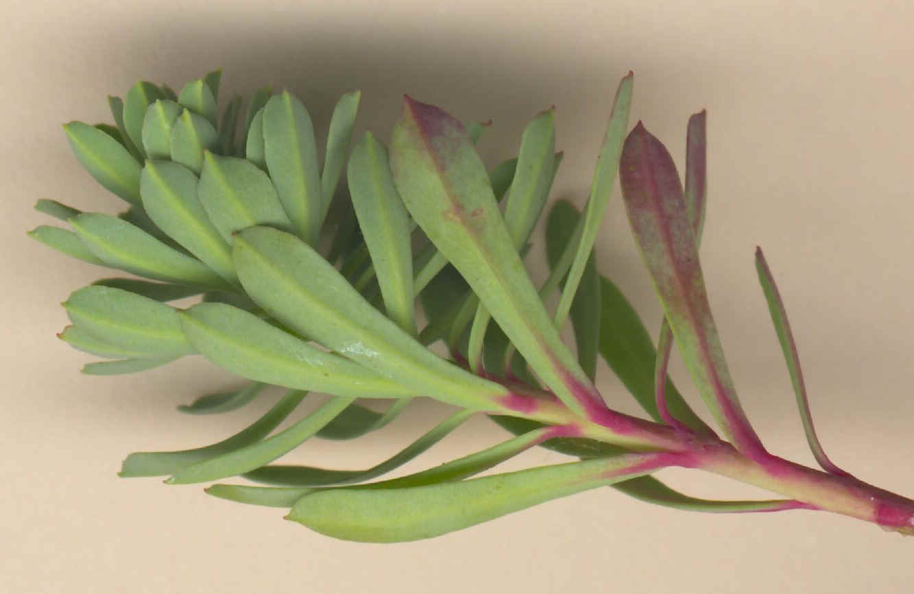Mittlere Stängelblätter spatelförmig, 6 - 18 mm lang, 2 - 3 mm breit, ganzrandig, seltener an der Spitze fein gezähnelt, mit Spitzchen, oft rotrandig