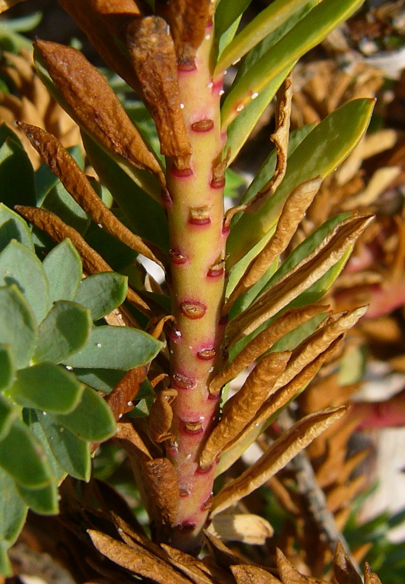 braunrot, Blättern graugrün, linealisch, 6 - 50 mm lang, 2 - 4 mm breit, 6 - 20 mal so lang wie breit