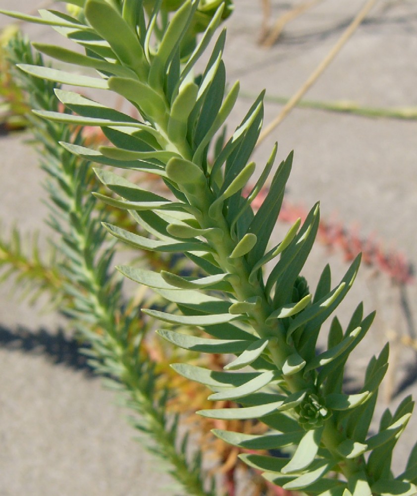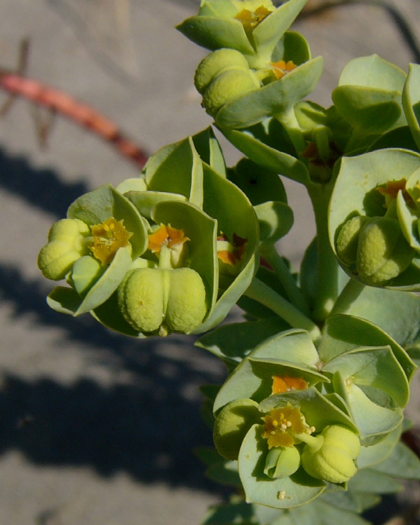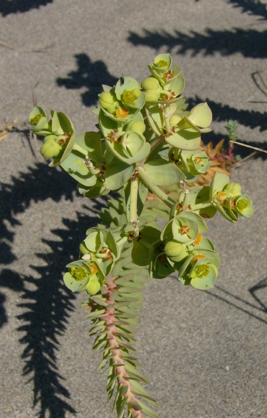 Euphorbia - Pflanze krautig, Stängelblätter blaugrün, 3 - 10 mm breit, Scheindolde mit 3 - 5 Doldenstrahlen, Drüsenanhänge halbmondförmig, mit kurzen Hörnchen, Hüllchenblätter getrennt, Kapsel warzig