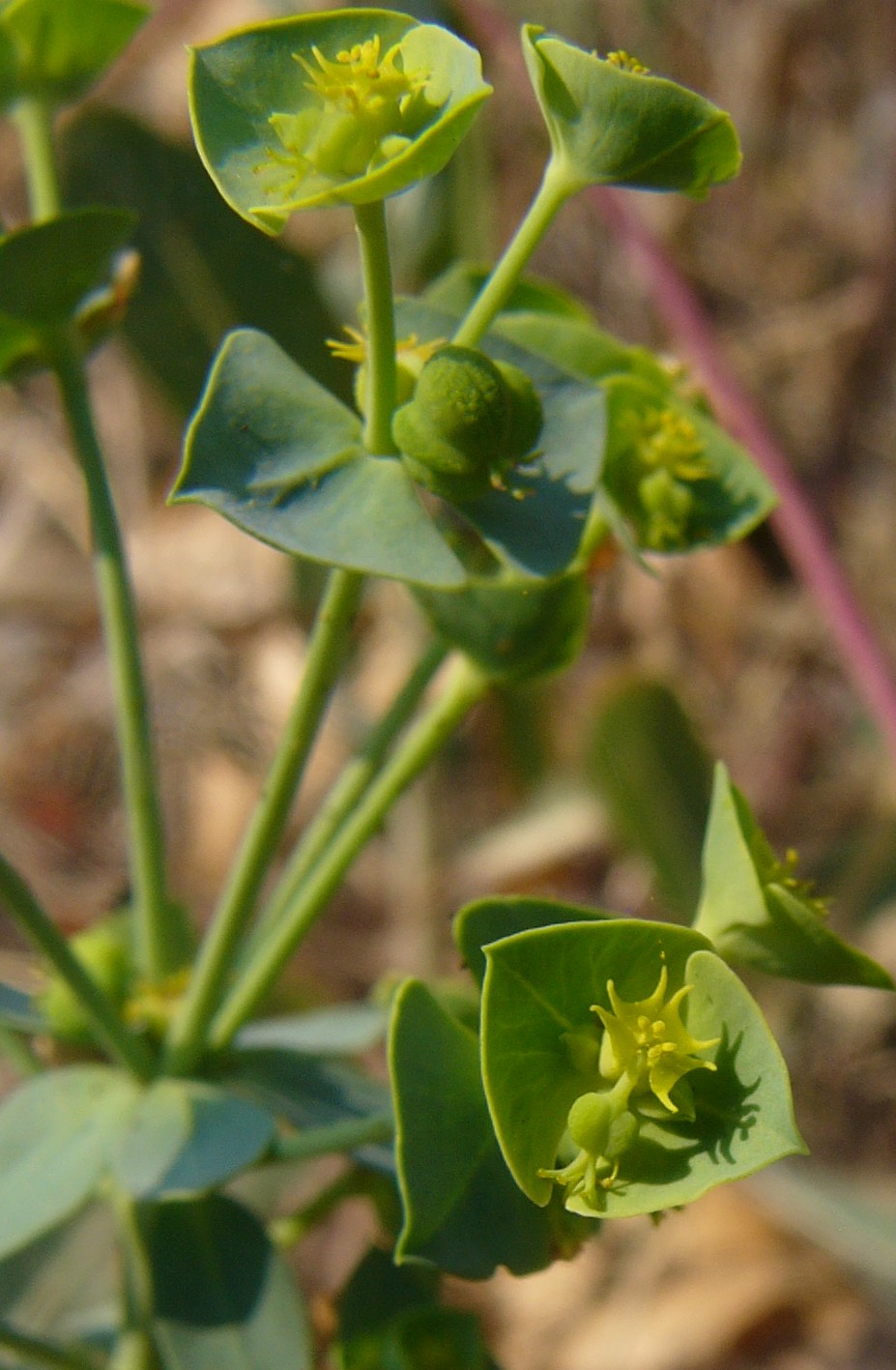 Euphorbia - Pflanze krautig, Stängelblätter blaugrün, 3 - 10 mm breit, Scheindolde mit 3 - 5 Doldenstrahlen, Drüsenanhänge halbmondförmig, Hüllchenblätter getrennt, Kapsel warzig