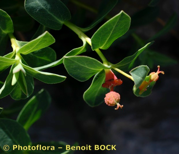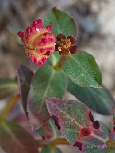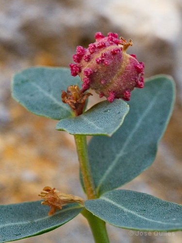 Kapsel kugelig, 4 - 5 mm im Durchmesser, mit kurzen kegelförmigen, roten Warzen