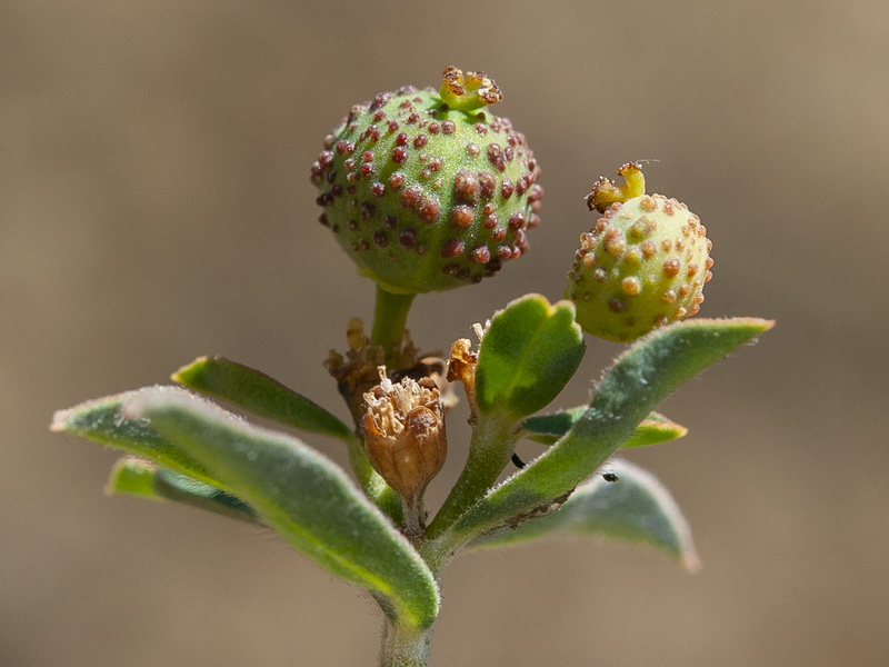 Kapsel 3 - 4 mm lang, kugelig, schwach gefurcht, mit kurzen kegelförmigen Warzen auch in den Furchen