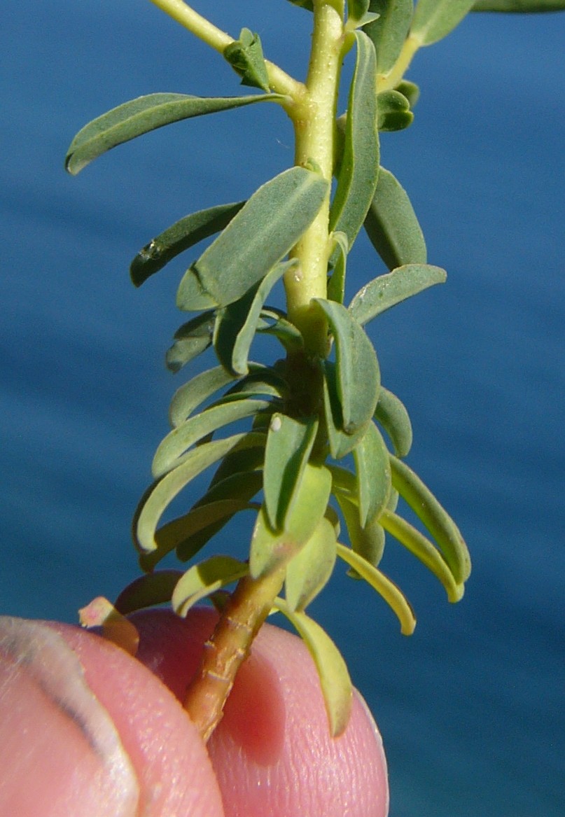 Balkan, Griechenland Blätter in der Mitte der fertilen Triebe +/- breit, 11 - 22 mm lang, 3 - 6 mm breit Doldenstrahlen und tote Zweige hinfällig, Stängel unter der Scheindolde mit 0 - 2 Seitenzweige, die in einem Winkel kleiner 50 ° abstehen > 2
