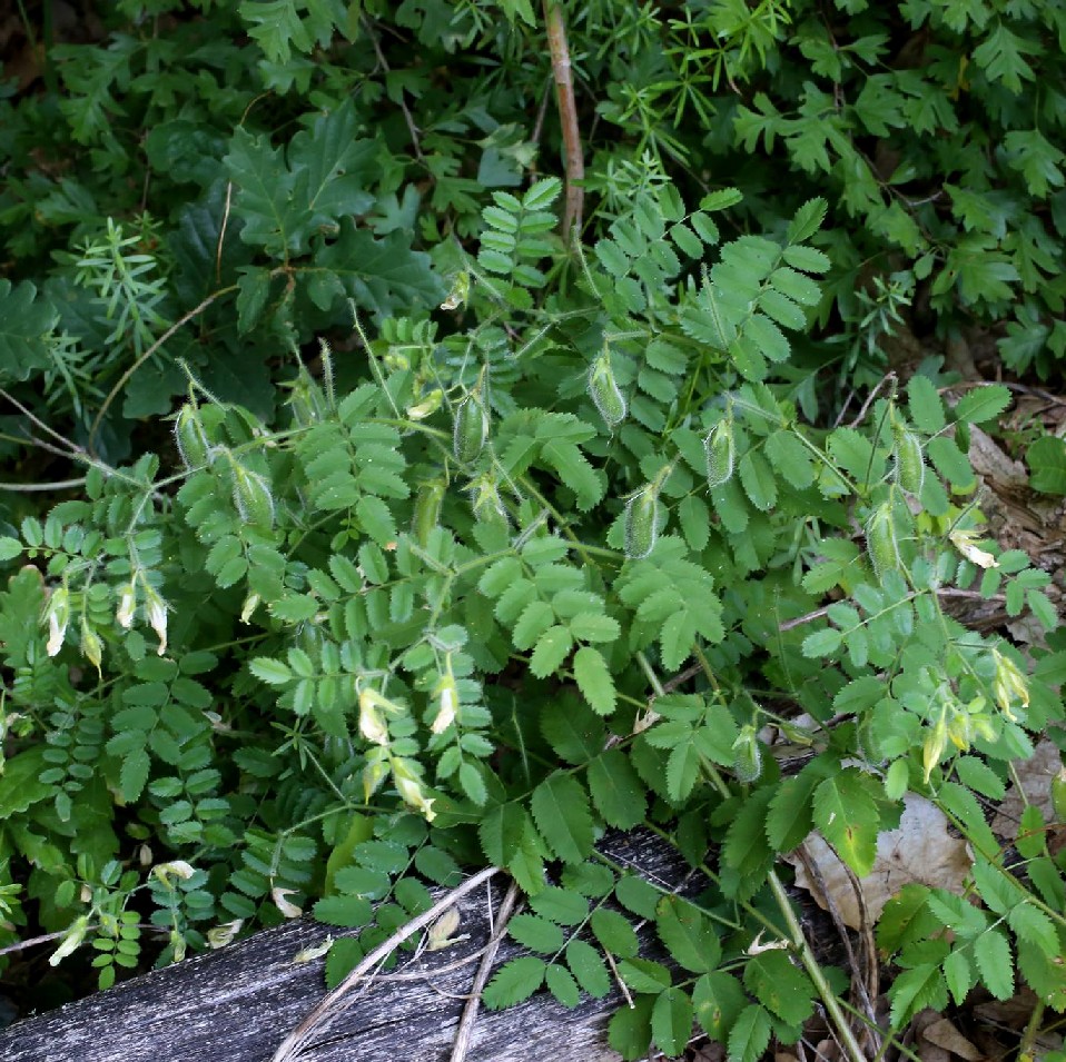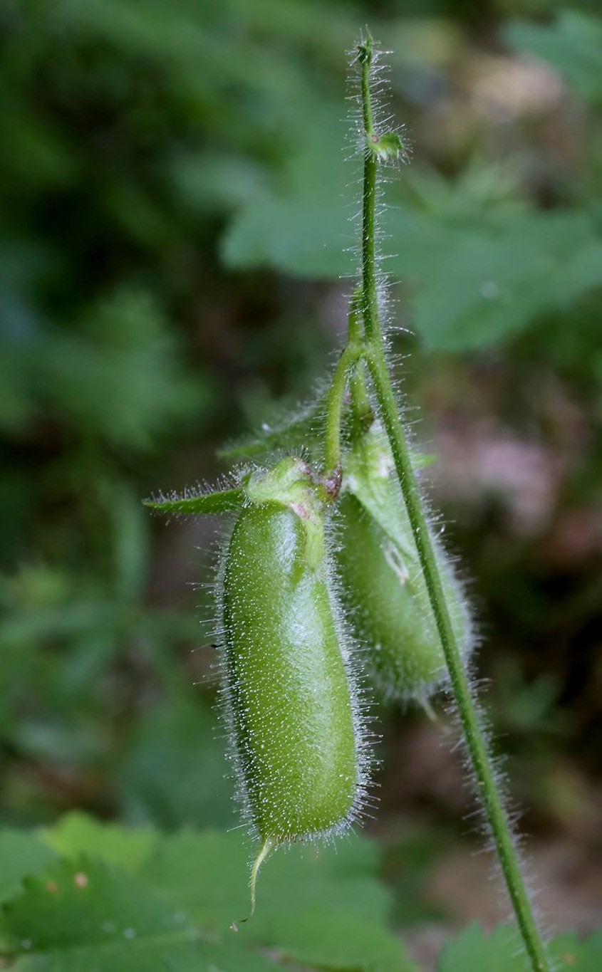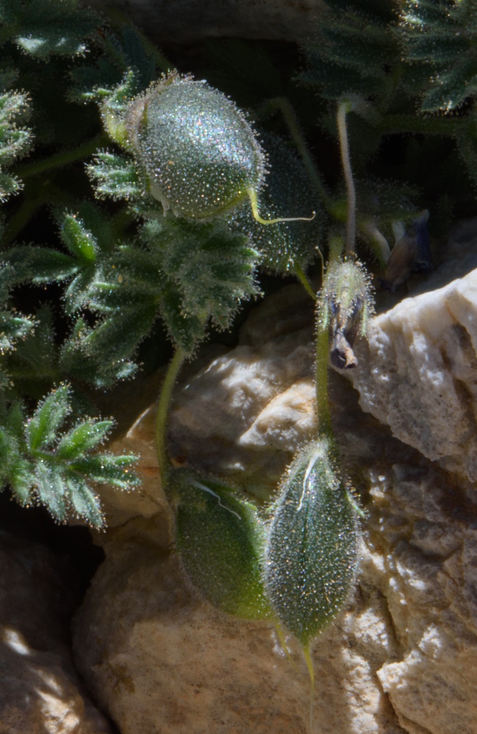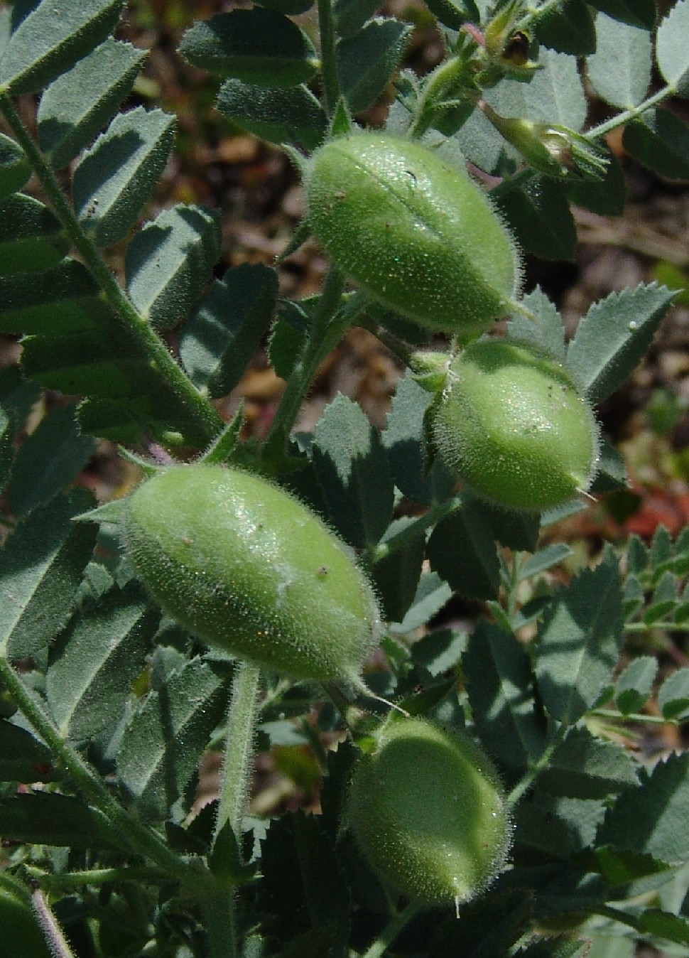 Hülsen eiförmig, 10 mm lang, aufgeblasen, drüsig behaart, kurz bespitzt