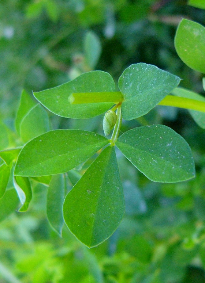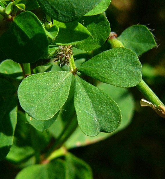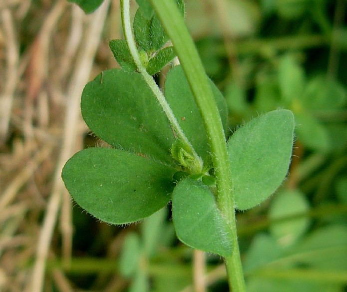 Obere Stängelblätter mit 3 länglich- eiförmigen Blättchen, am Grund mit 2 großen Nebenblättern (= grundständiges Fiederpaar),