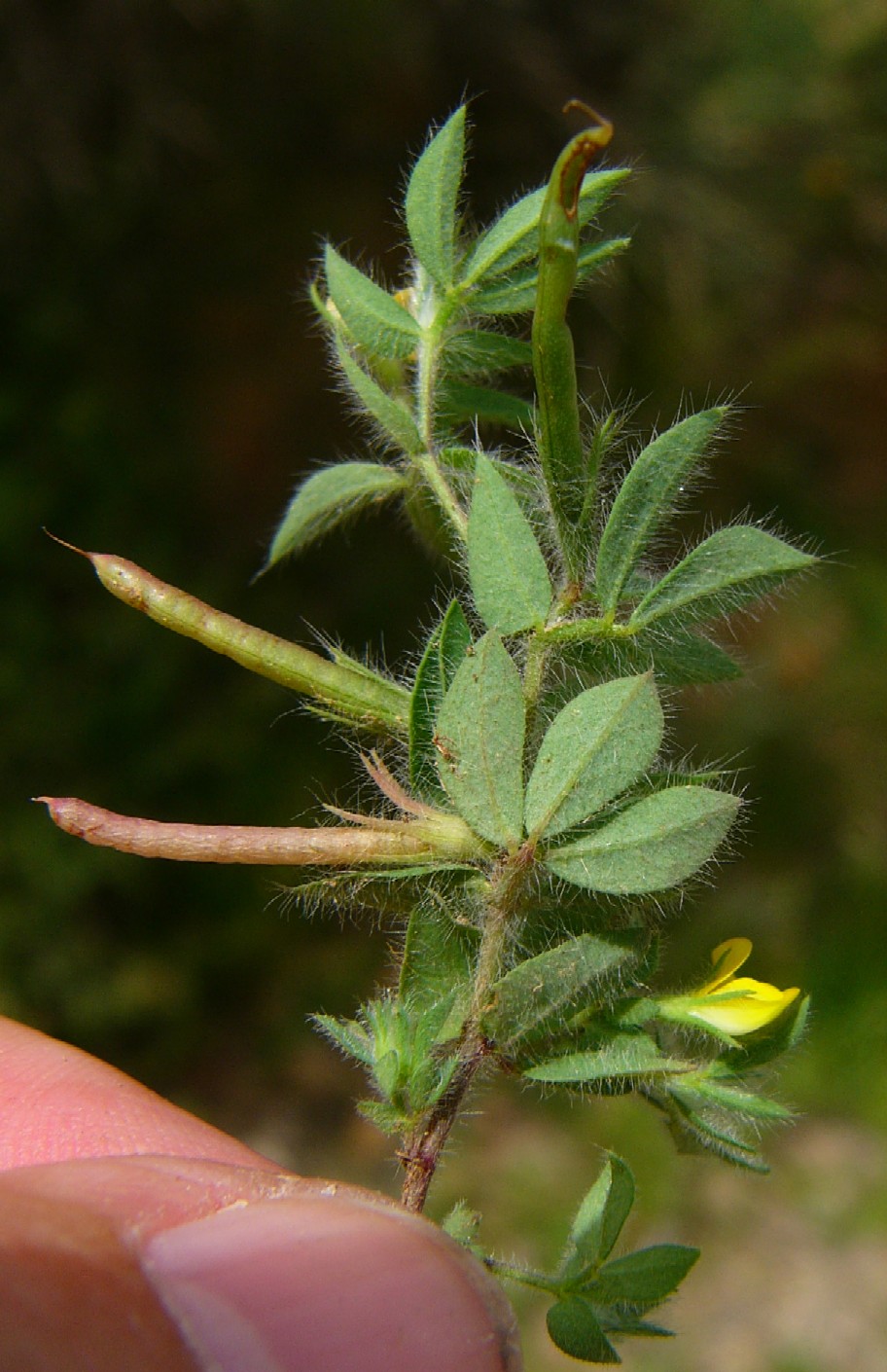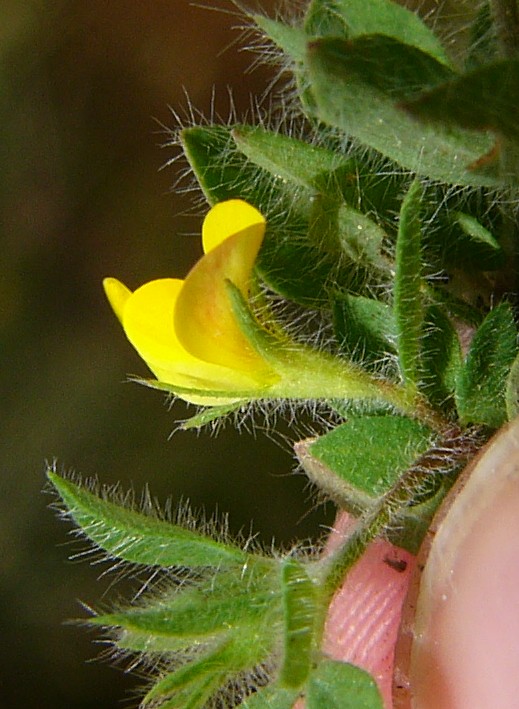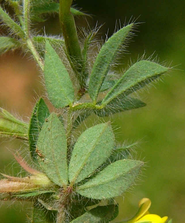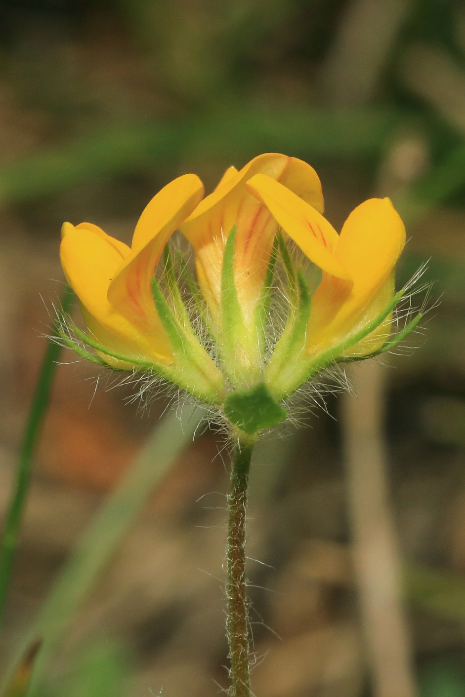 Lotus - Blüten gelb oder orange, Früchte nicht geflügelt, aufgeblasen oder eingeschnürt, Stängel/Blätter mit langen, abstehenden Haaren, Blütenstandsstiel lang, Kelchzähne +/- gleich, viel länger wie die Kelchröhre, Frucht 15 - 25 mm lang