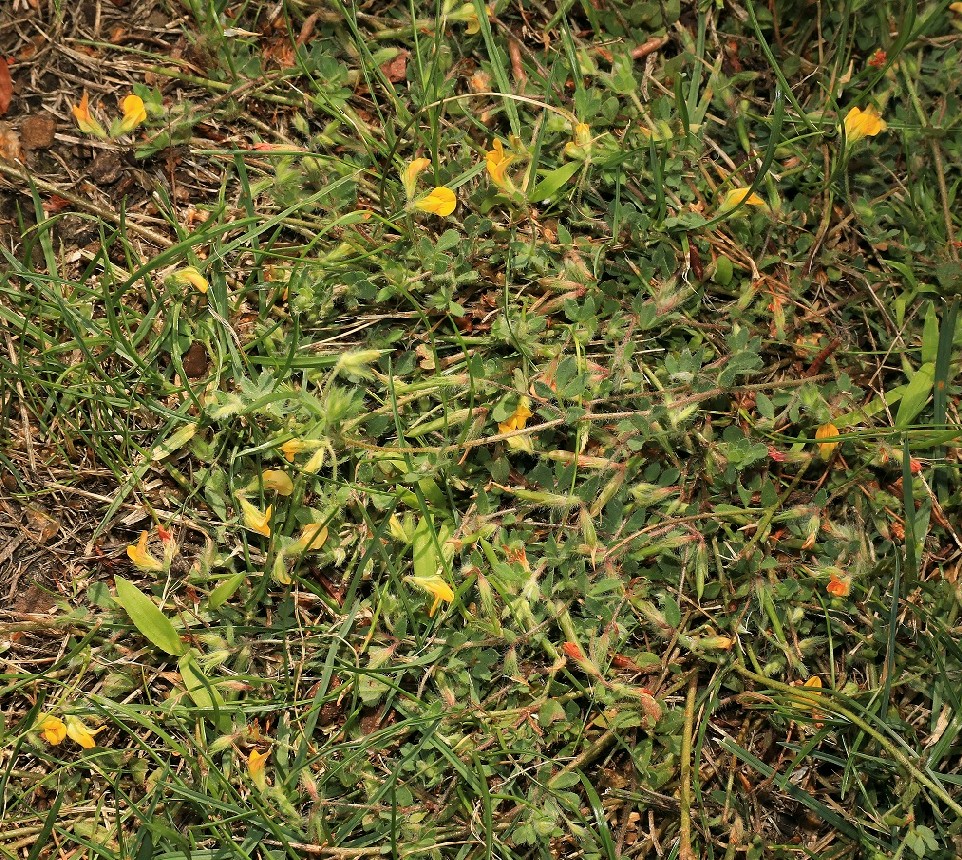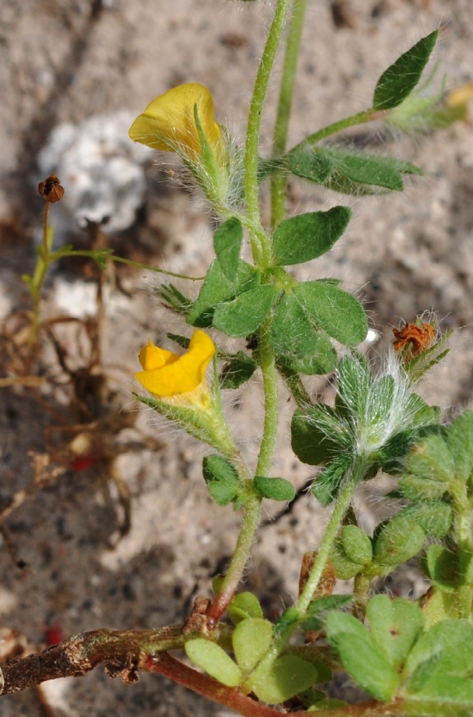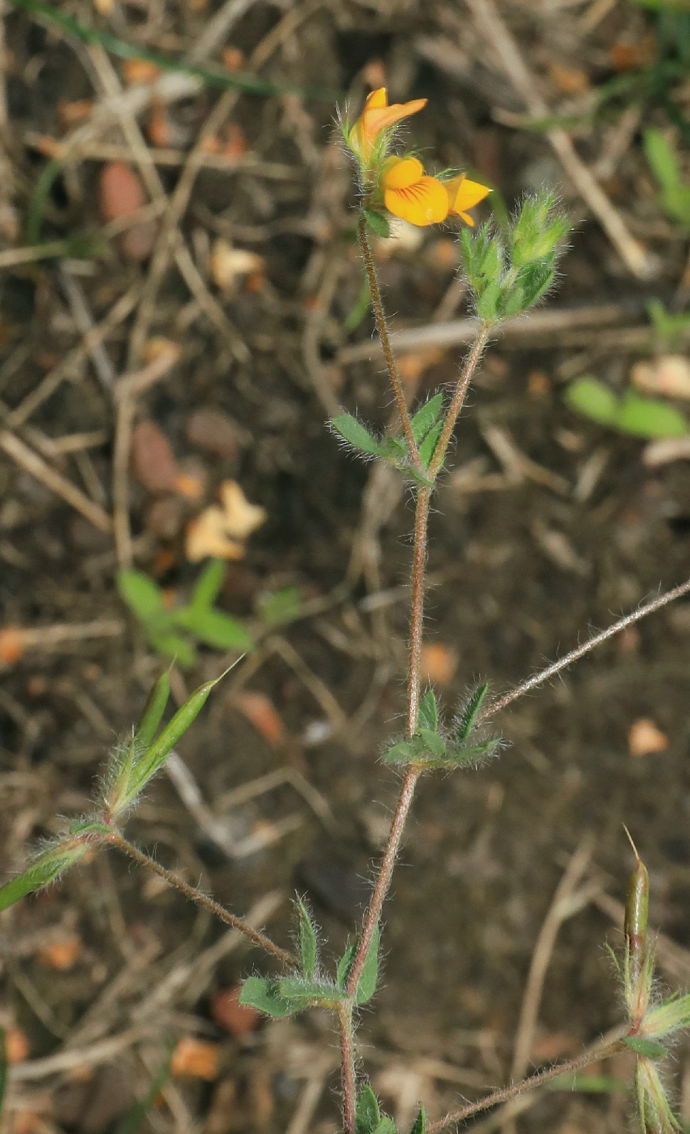 Lotus - Blüten gelb oder orange, Früchte nicht geflügelt, aufgeblasen oder eingeschnürt, Stängel/Blätter mit langen, abstehenden Haaren, Blütenstandsstiel lang, Kelchzähne +/- gleich, viel länger wie die Kelchröhre, Frucht 15 - 25 mm lang
