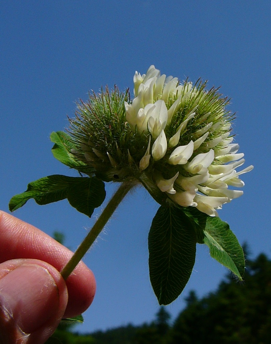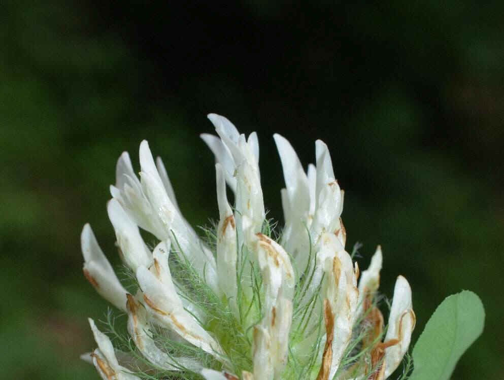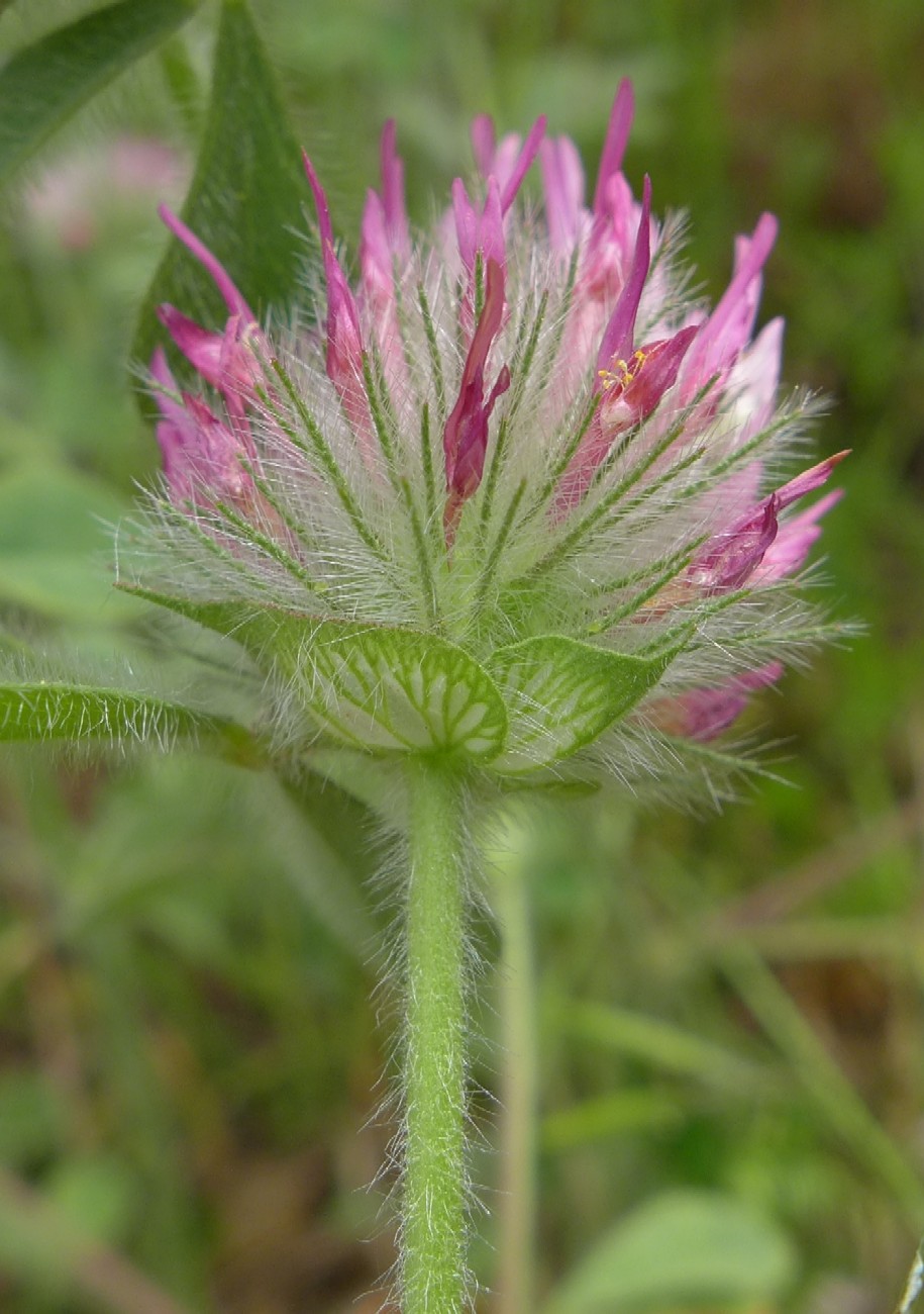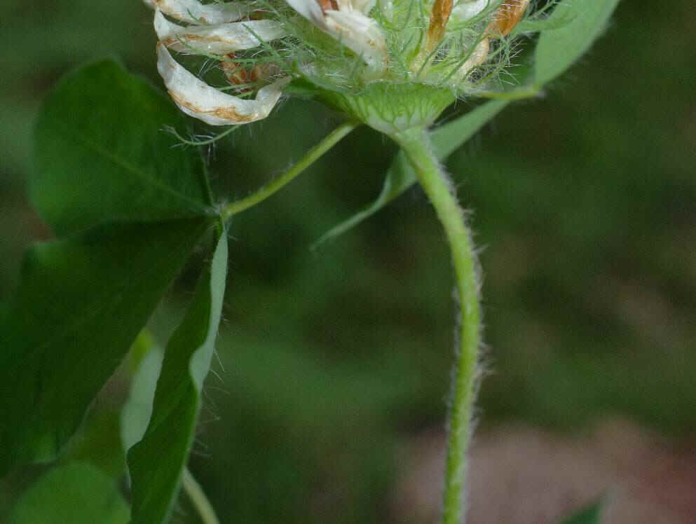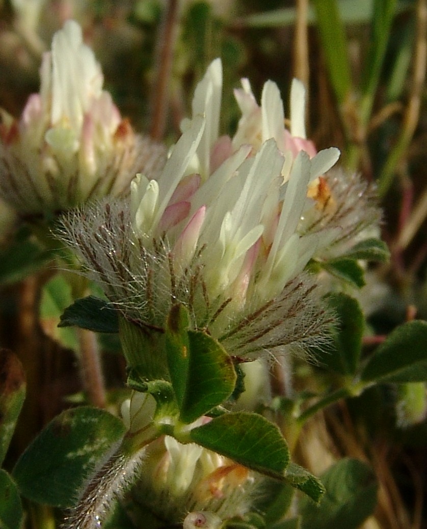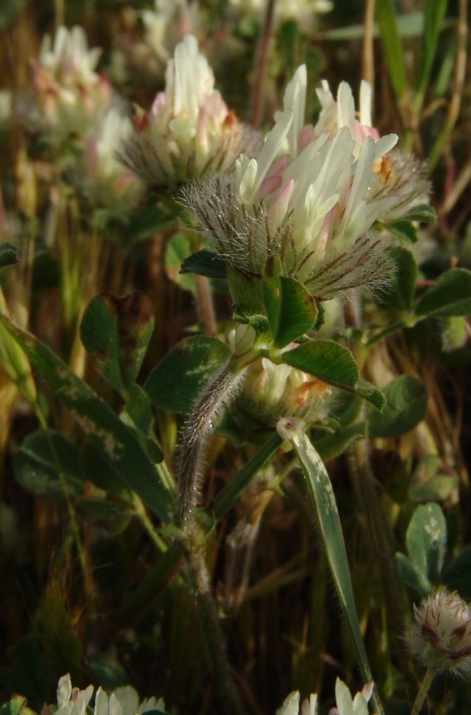 Trifolium - Blütenstand einköpfig, +/- sitzend, 15 - 20 mm im Durchmesser, vielblütig, Blüten weiß oder rosa, 12 - 15 mm lang, länger als der Kelch, Kelch nicht aufgeblasen, Kelchzähne pfriemlich, deutlich länger als die Kelchröhre, Blätter behaart, Stängel abstehend behaart