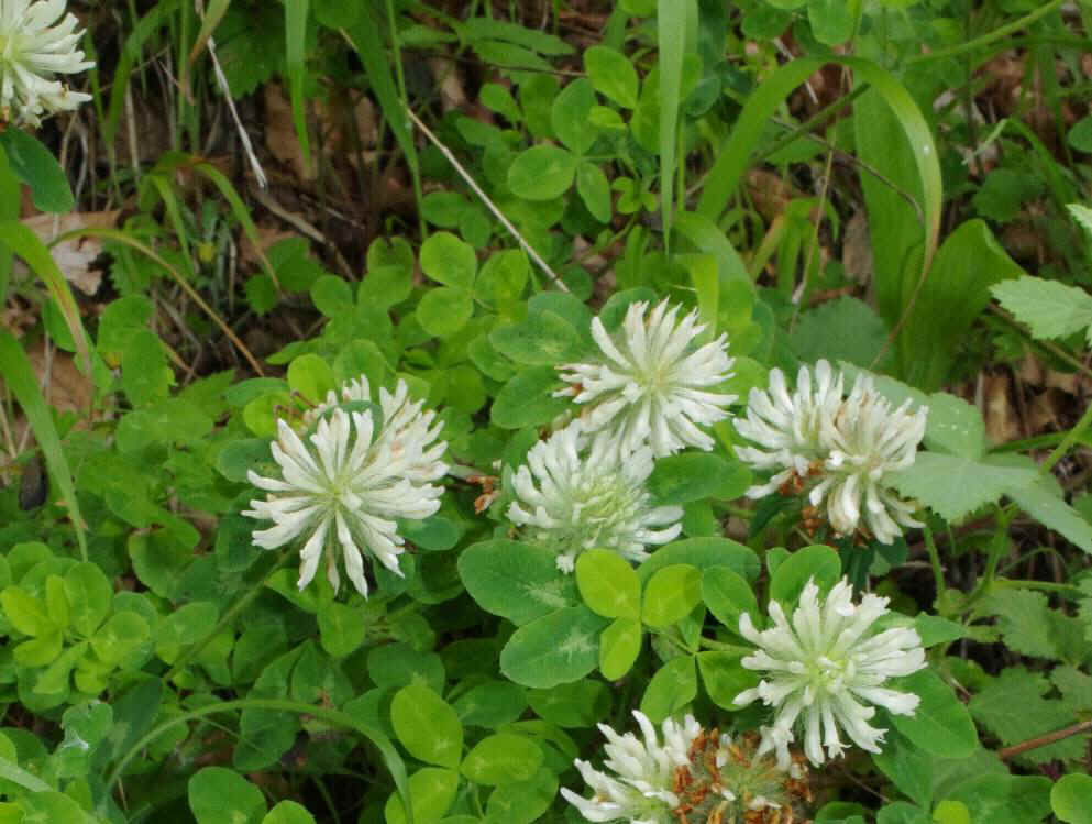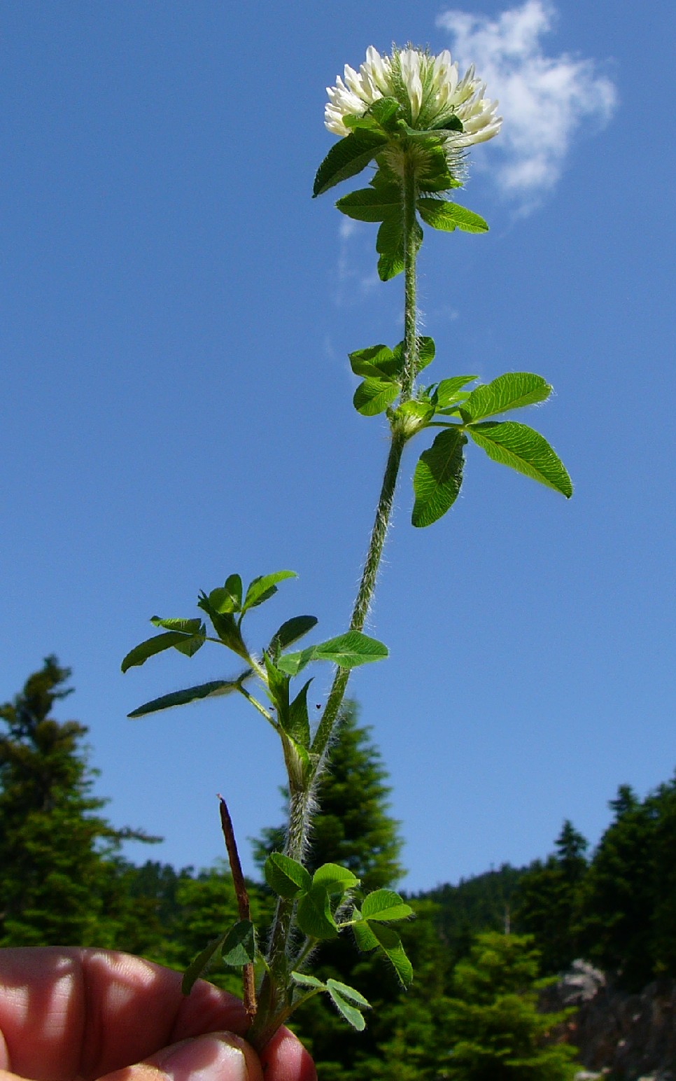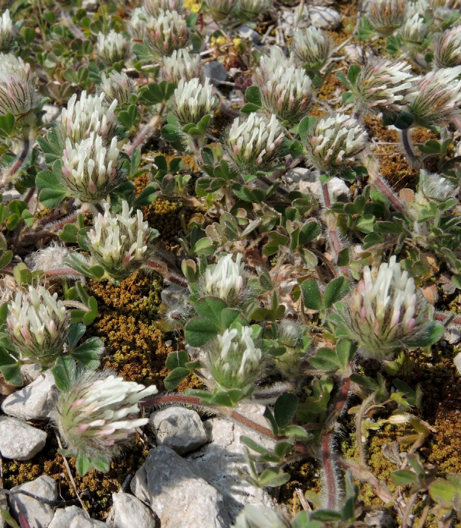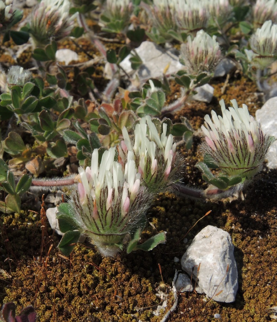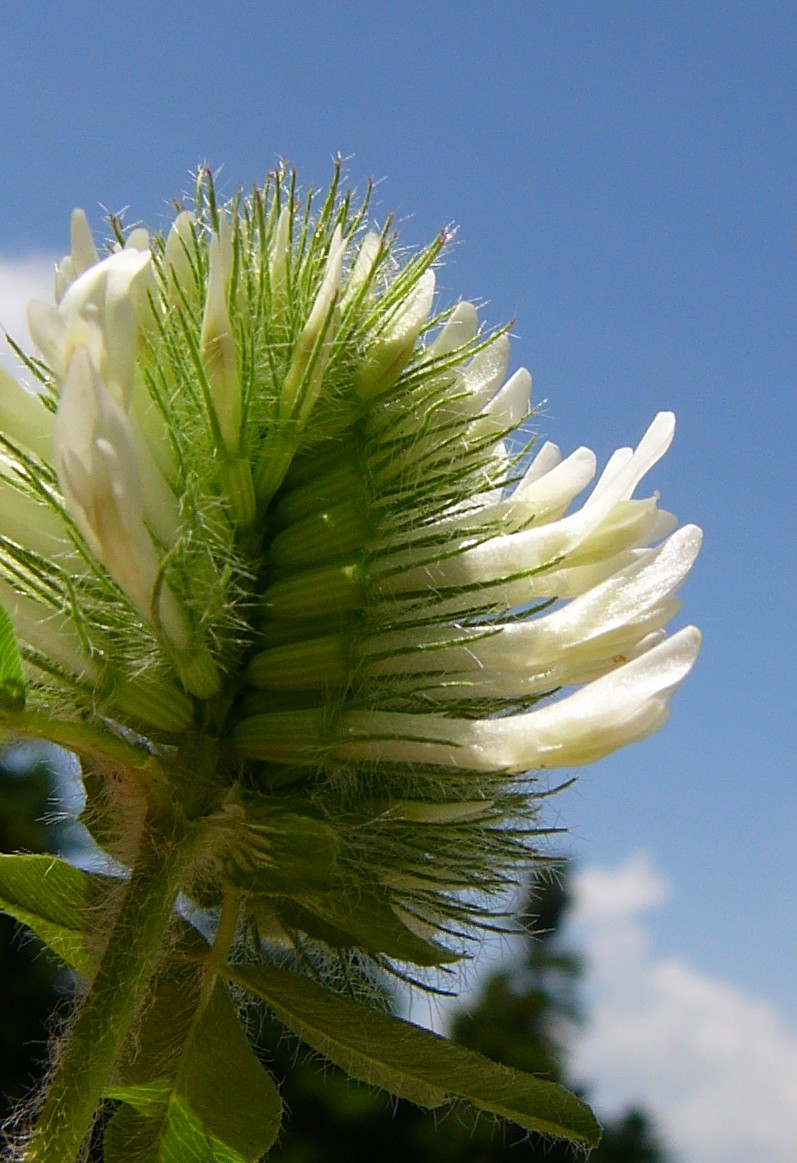 Trifolium - Blütenstand einköpfig, +/- sitzend, 15 - 20 mm im Durchmesser, vielblütig, Blüten weiß oder rosa, 12 - 15 mm lang, länger als der Kelch, Kelch nicht aufgeblasen, Kelchzähne pfriemlich, deutlich länger als die Kelchröhre, Blätter behaart, Stängel abstehend behaart
