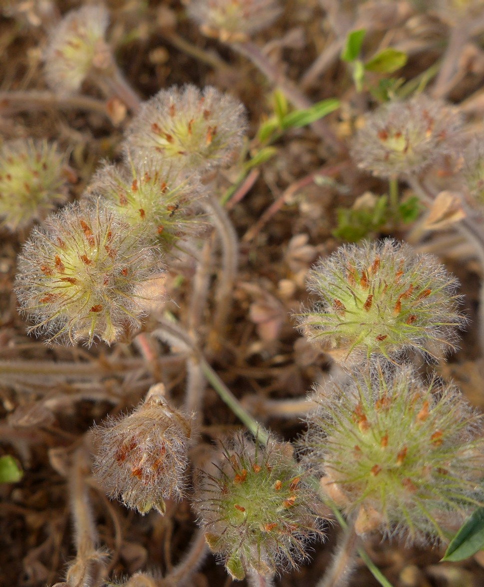 Köpfchen halbkugelig, sitzend, 15 - 20 mm im Durchmesser, im unteren Teil von einer Hülle umgeben, die aus 2 gegenständigen, 3- teiligen Blättern und deren Nebenblättern besteht, Nebenblätter den unteren Teil des Köpfchen einhüllend
