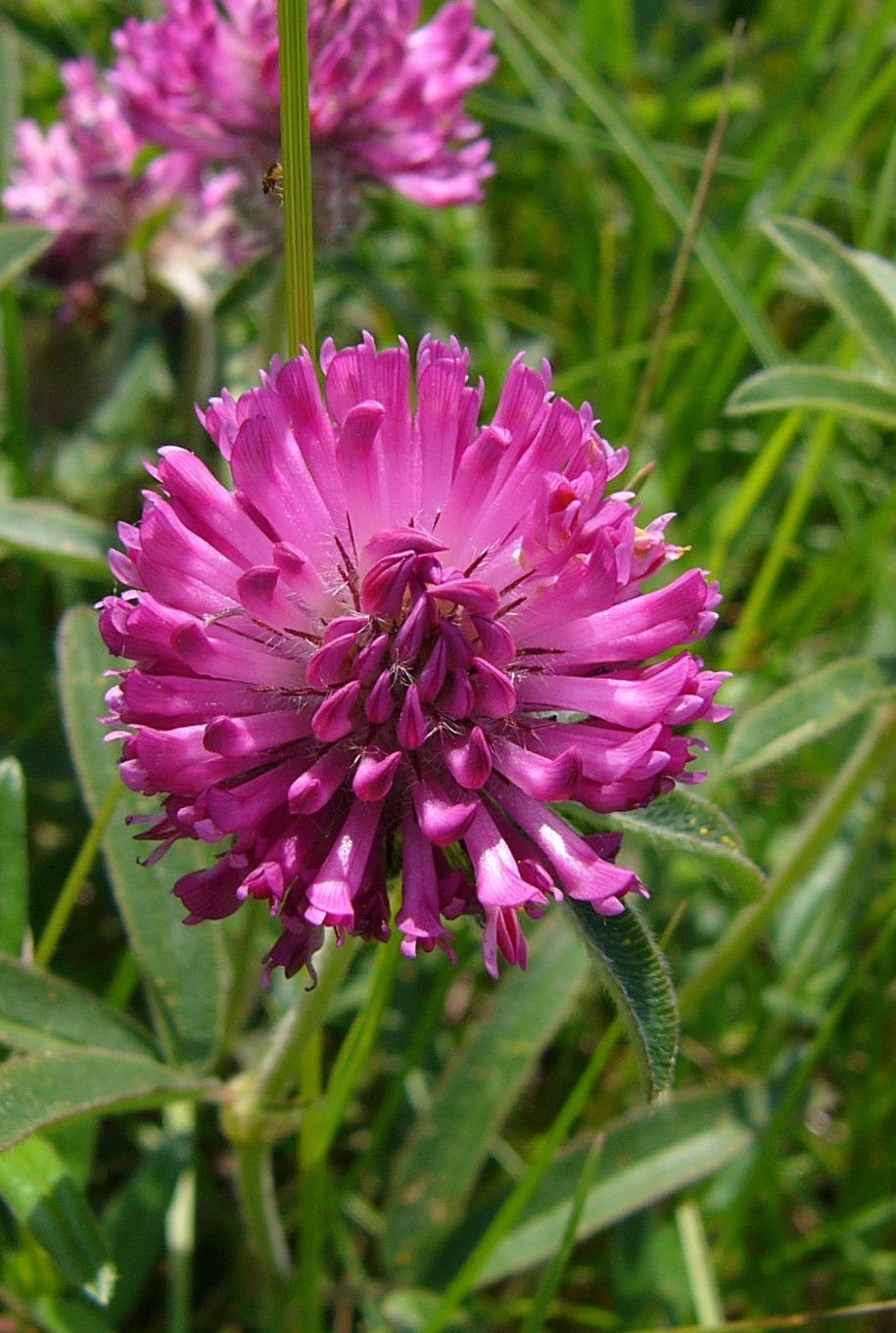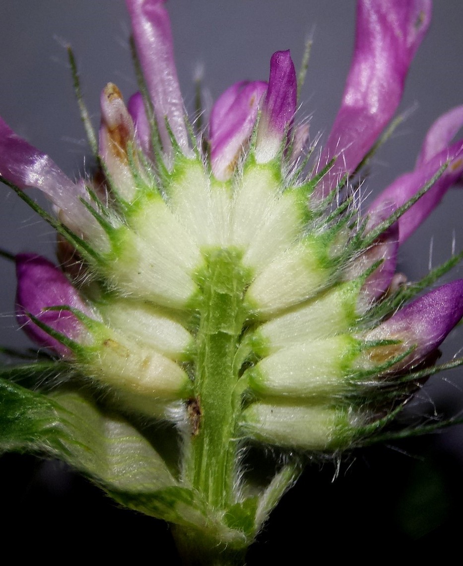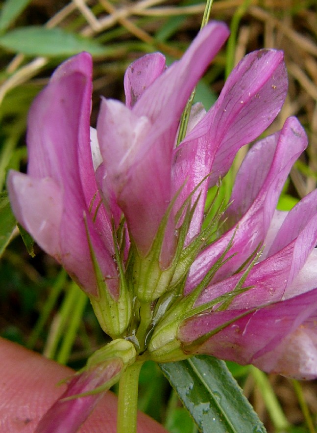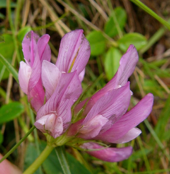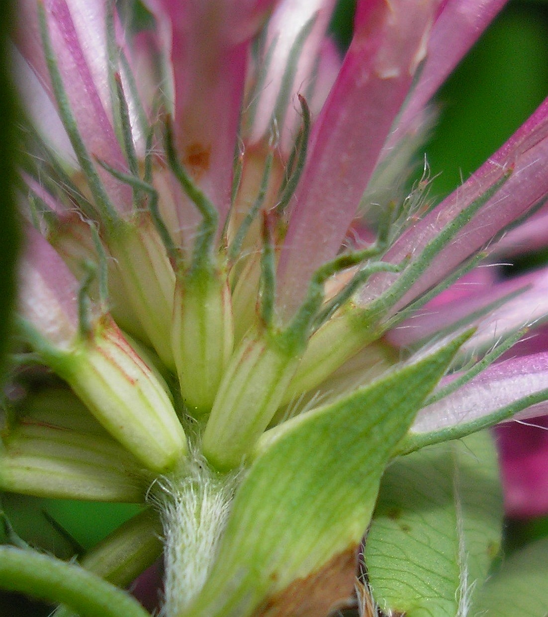 Blüten 12 - 20 mm, dunkelrosa, Fahne wenig länger als Fahne und Schiffchen Kelchröhre außen kahl, 10 Nerven, Kelchzähne jedoch deutlich bewimpert