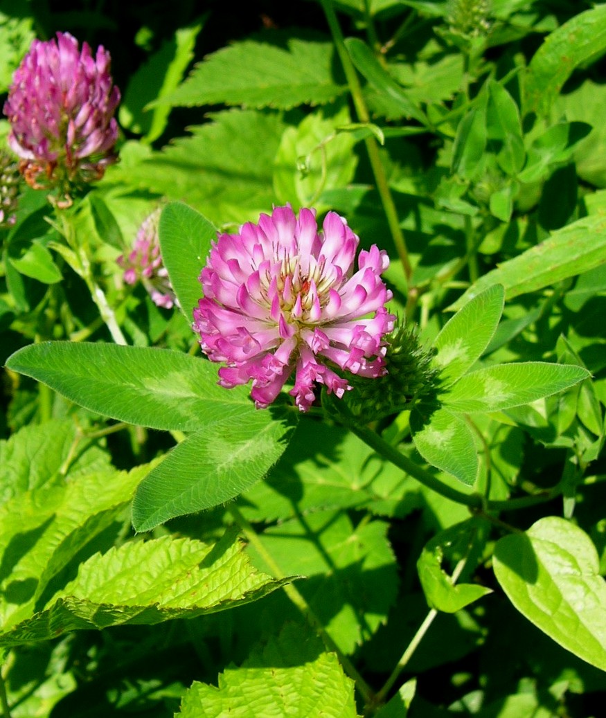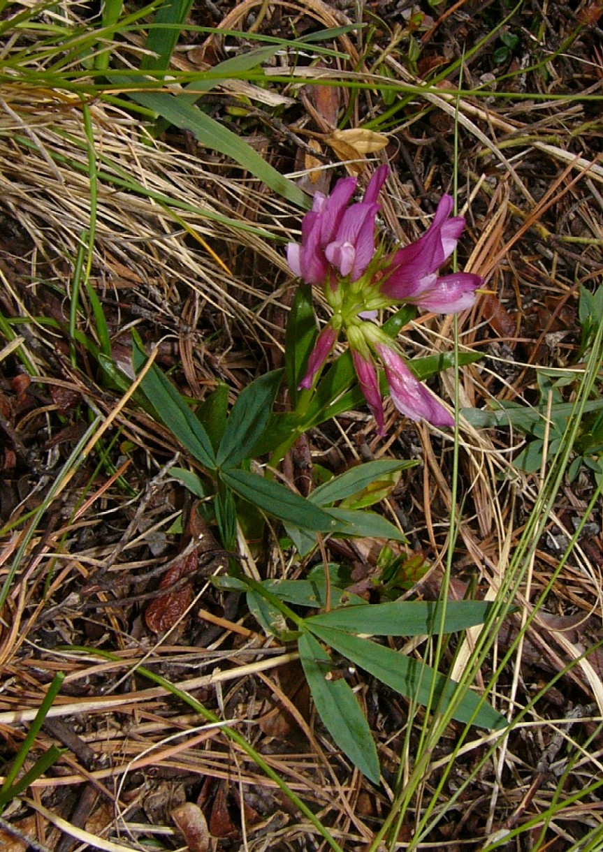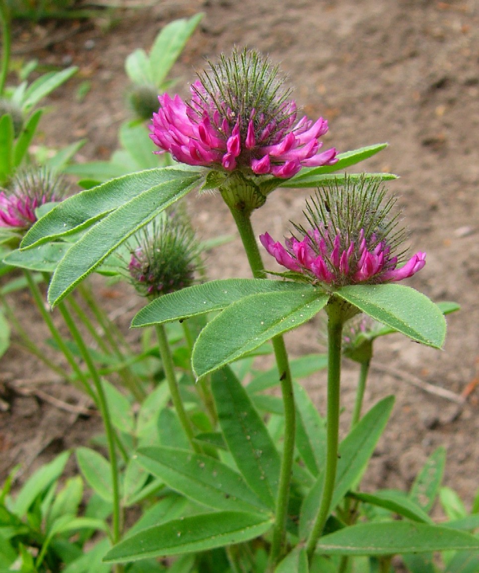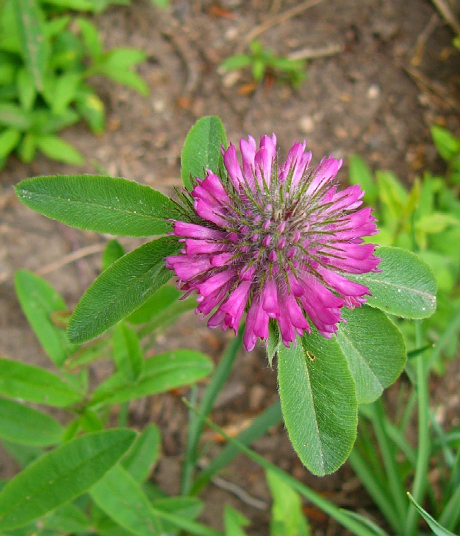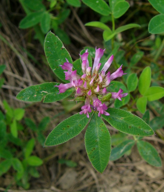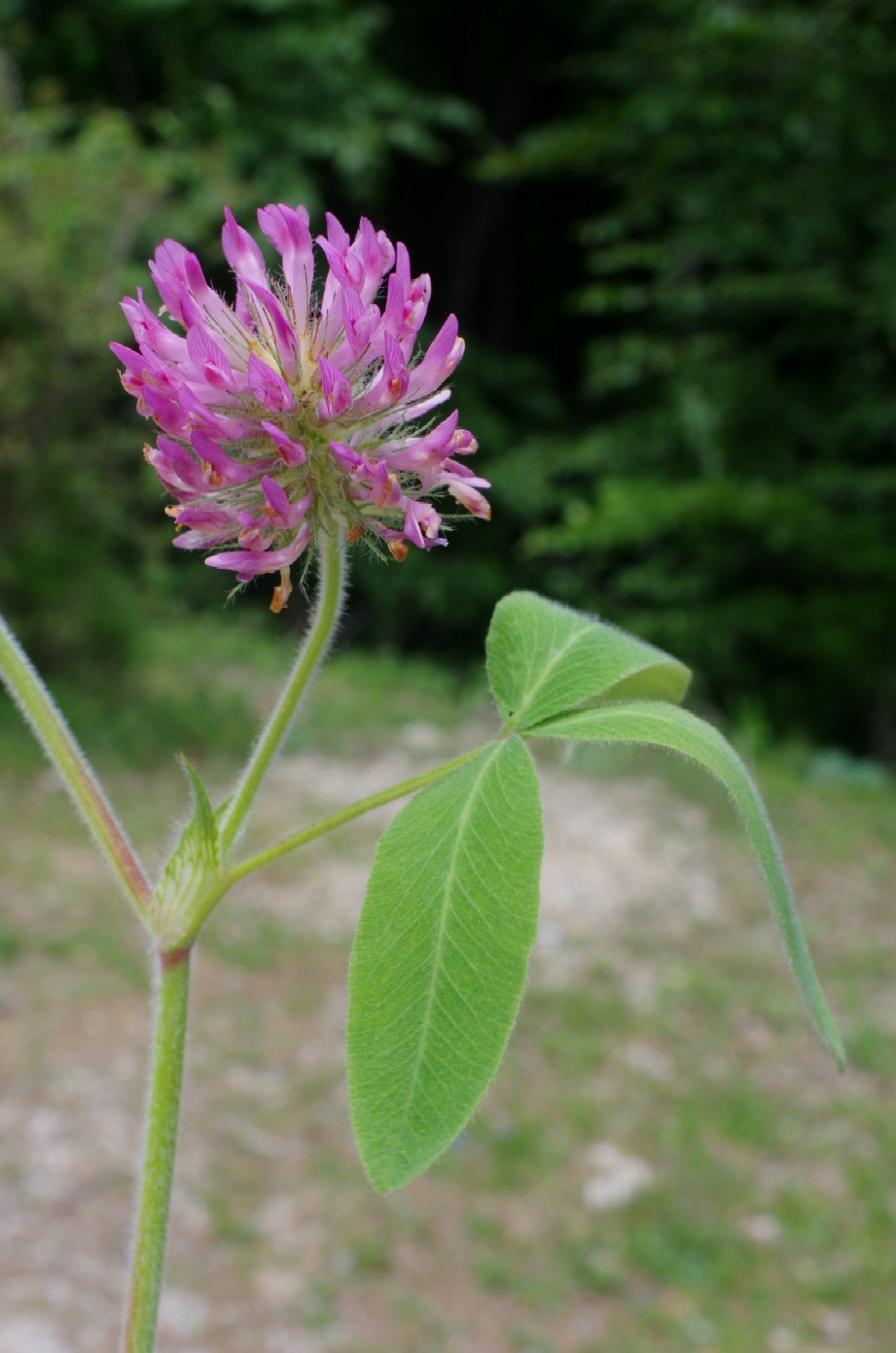 8 Blüten, Blüten rotviolett, 12 - 14 mm groß, kurz gestielt Nebenblätter ca. 7 mm lang, Blätter 3- teilig, alle grundständig