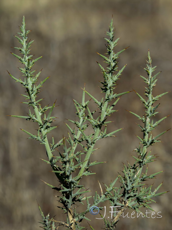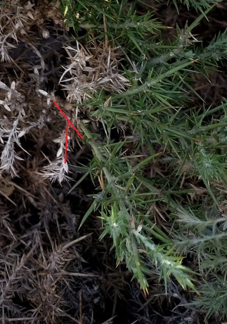 Estremadura) Primärdornen sehr dicht stehend, langhaarig, aufrecht, schlank Primärphyllodien im unteren Stängelbereich breit, blattartig, weich, nicht dornig > Ulex densus