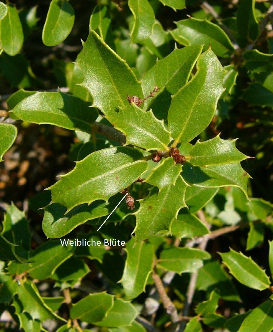 2 Blätter +/- ledrig, 4 - 9 cm lang, länglich elliptisch, mit 8 - 14 Paar dornigen Zähnen