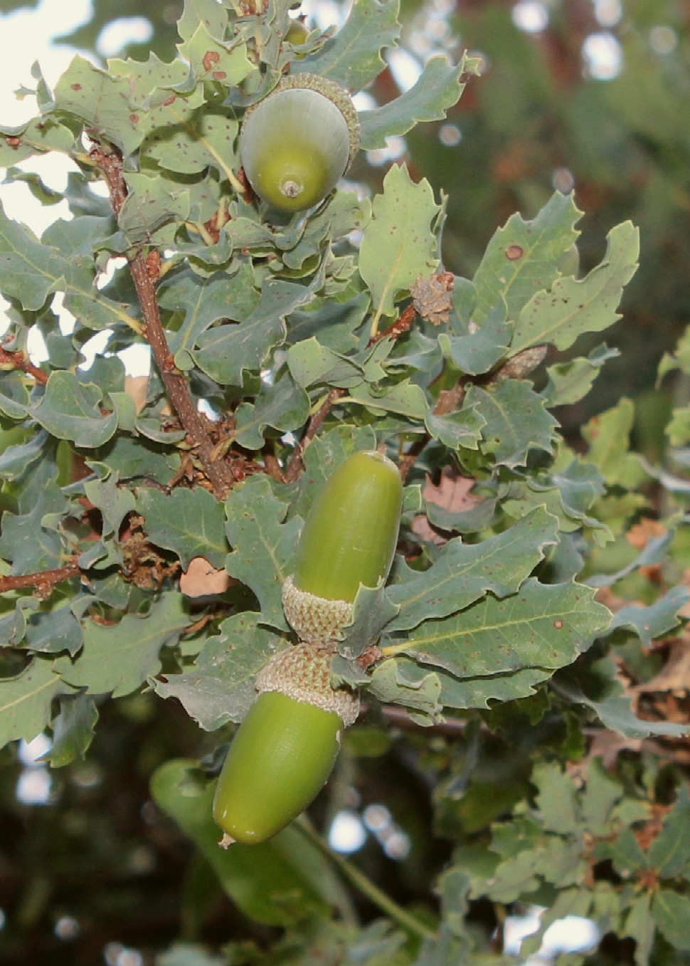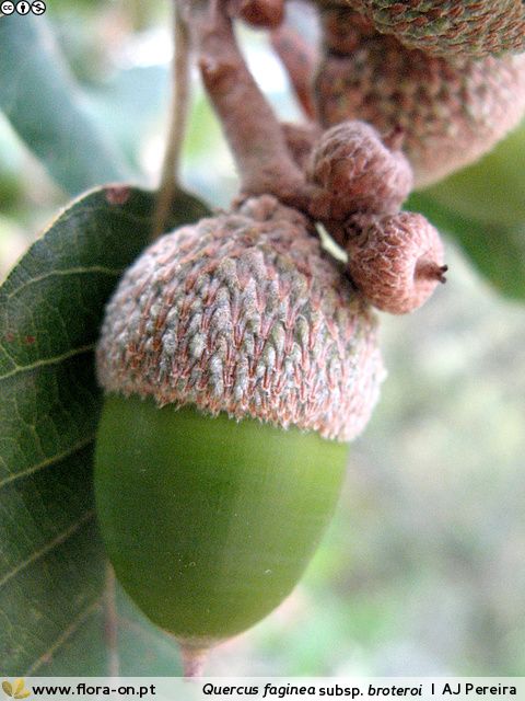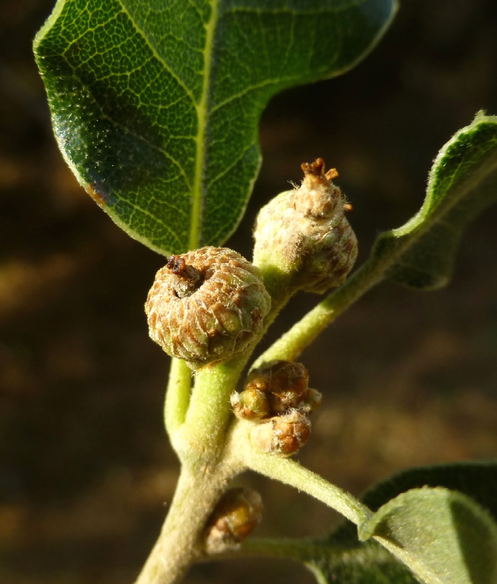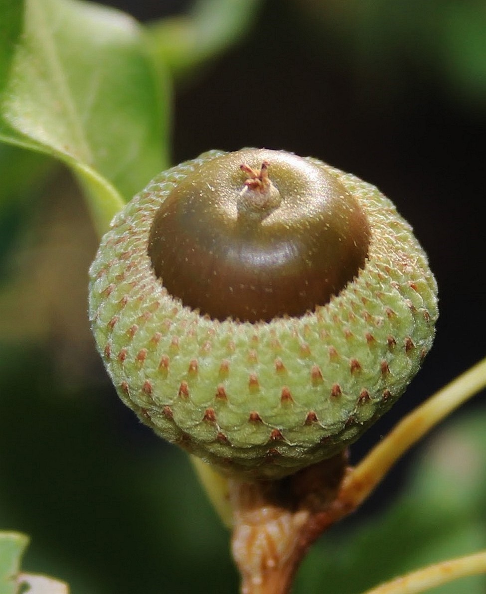 Früchte +/- sitzend, Eichel 15 - 35 mm lang, Fruchtbecher 10 - 20 mm im Durchmesser, Fruchtschuppen eiförmig, in eine stumpfe Spitze ausgezogen, anliegend