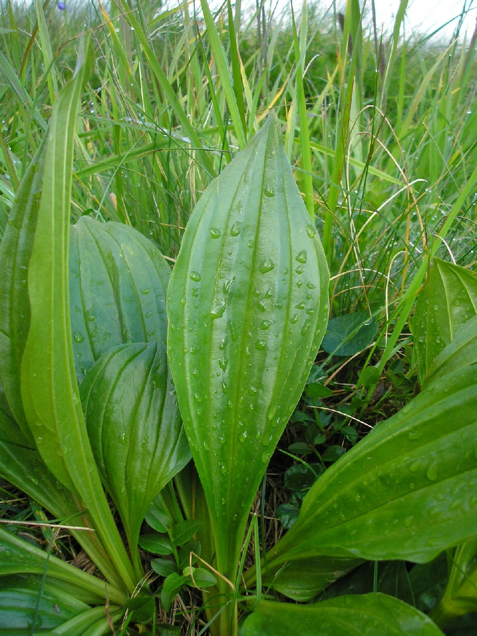 Stängelblätter eiförmig bis eilanzettlich, glänzend, 3 bis 7 cm breit, Blattnerven parallel Grundblätter lanzettlich, paralleladerig