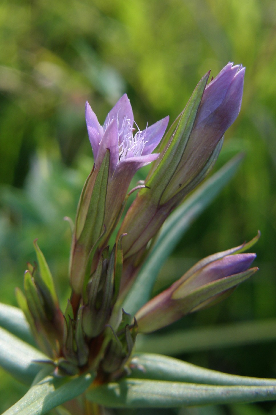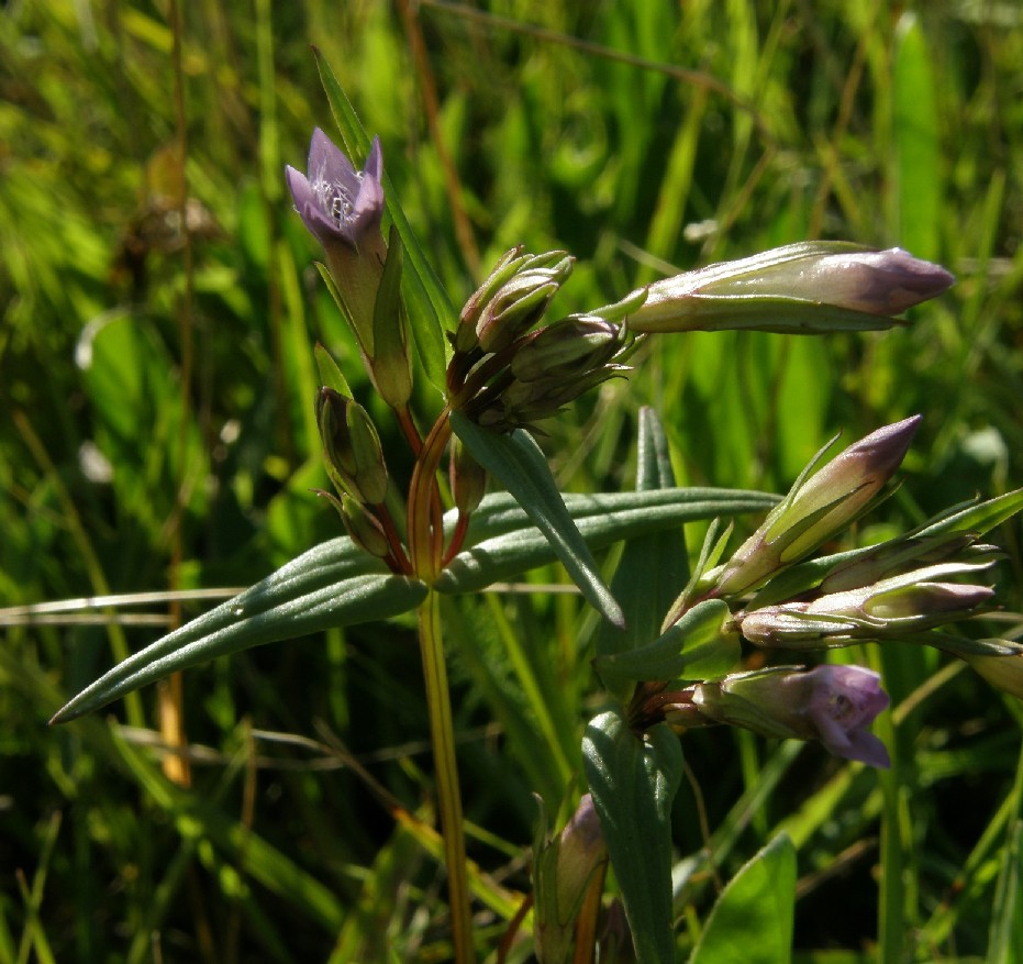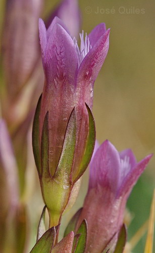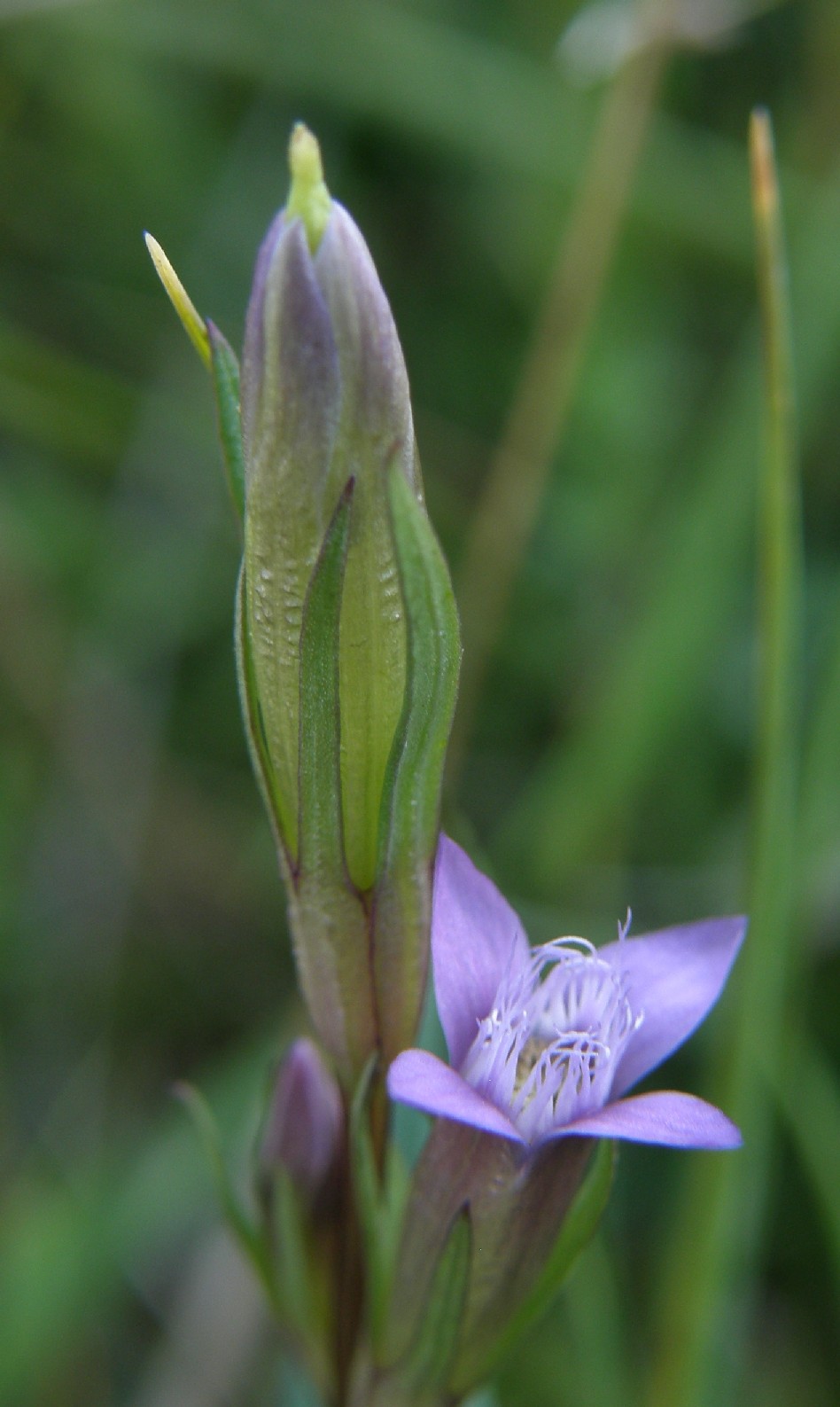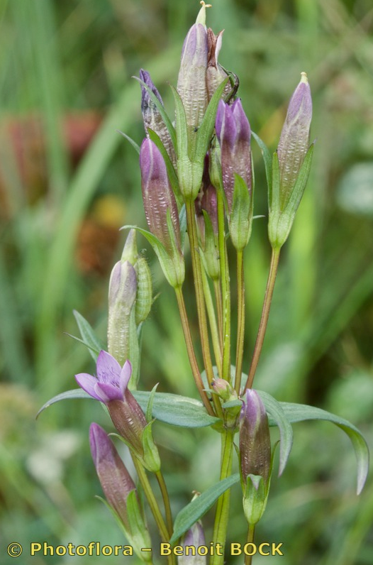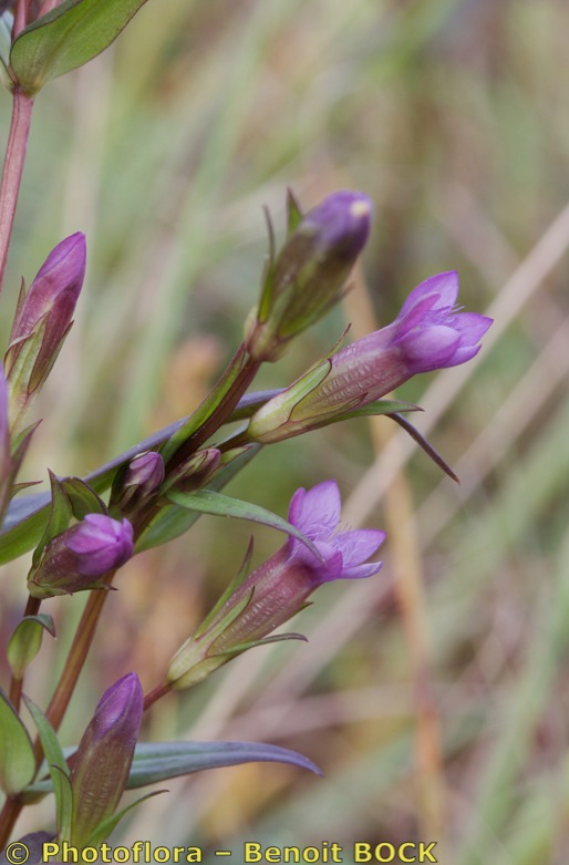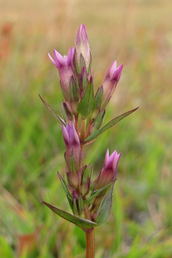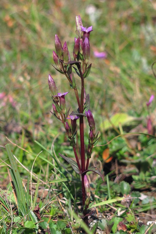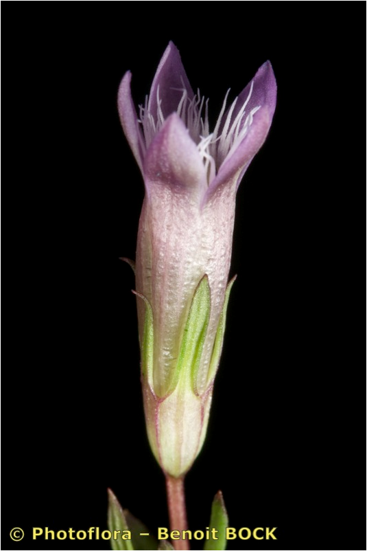 Gentianella- Blüten klein, rotviolett mit 5 meist aufrechten Kronblattzipfeln, Kelchzipfel am Rand grün oder rot, +/- glatt