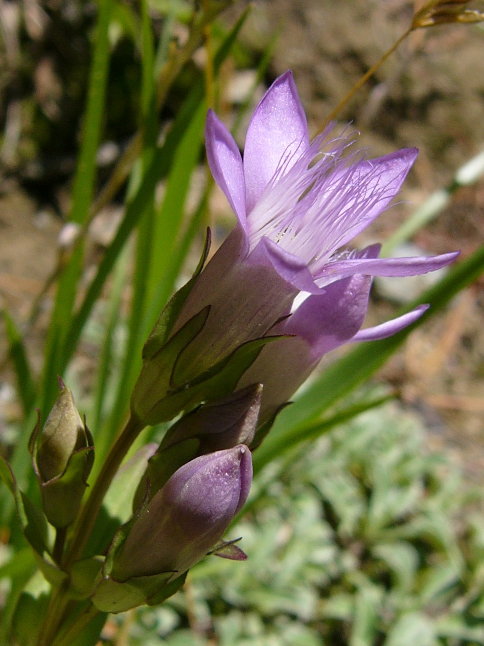 Gentianella- Blüten groß, violett mit 5 meist ausgebreiteten Kronblattzipfeln, Kelchzipfel am Rand grün oder rot, +/- glatt