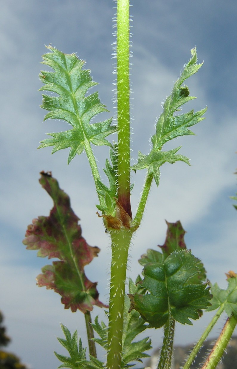 Stängel mit langen, abstehenden oder zurückgebogenen Haaren, Stängelblätter bis 5 cm lang, tief fiederschnittig, Fiederabschnitte spitz, Tragblätter lanzettlich, oft bräunlich