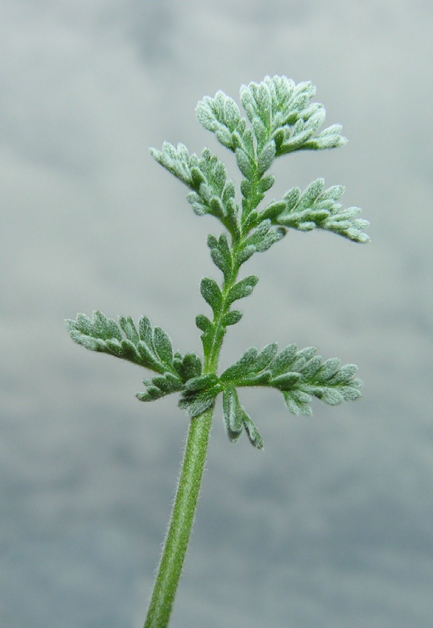 Blattfiedern fiederspaltig, mit Zwischenfiedern, dicht weißfilzig behaart, mit kurzen Abschnitten, Fiederchen am Rand oft umgerollt