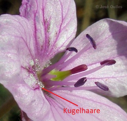 mit Kugelhaaren, obere Kronblätter mit mit Bäumchenmuster, Blätter gefiedert, ohne