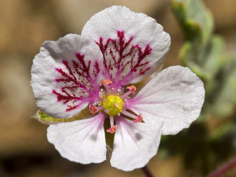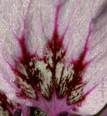 Kronblätter 9 - 12 mm lang, weiß oder hellrosa, die oberen beiden Kronblätter mit weißen Flecken, die von einer bäumchenartigen dunkelroten Maserung abgegrenzt werden, am unteren Rand mit Kugelhaaren
