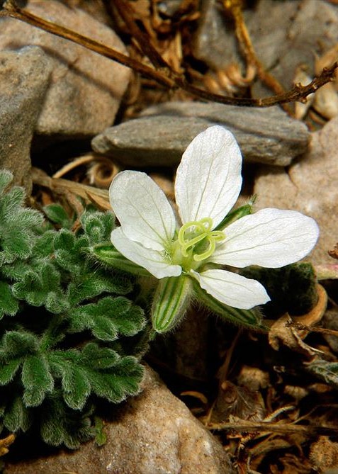 der Insel Samos Blüten weiß oder hellrosa, Pflanze am Grund verholzt, harte Matten bildend > Erodium vetteri