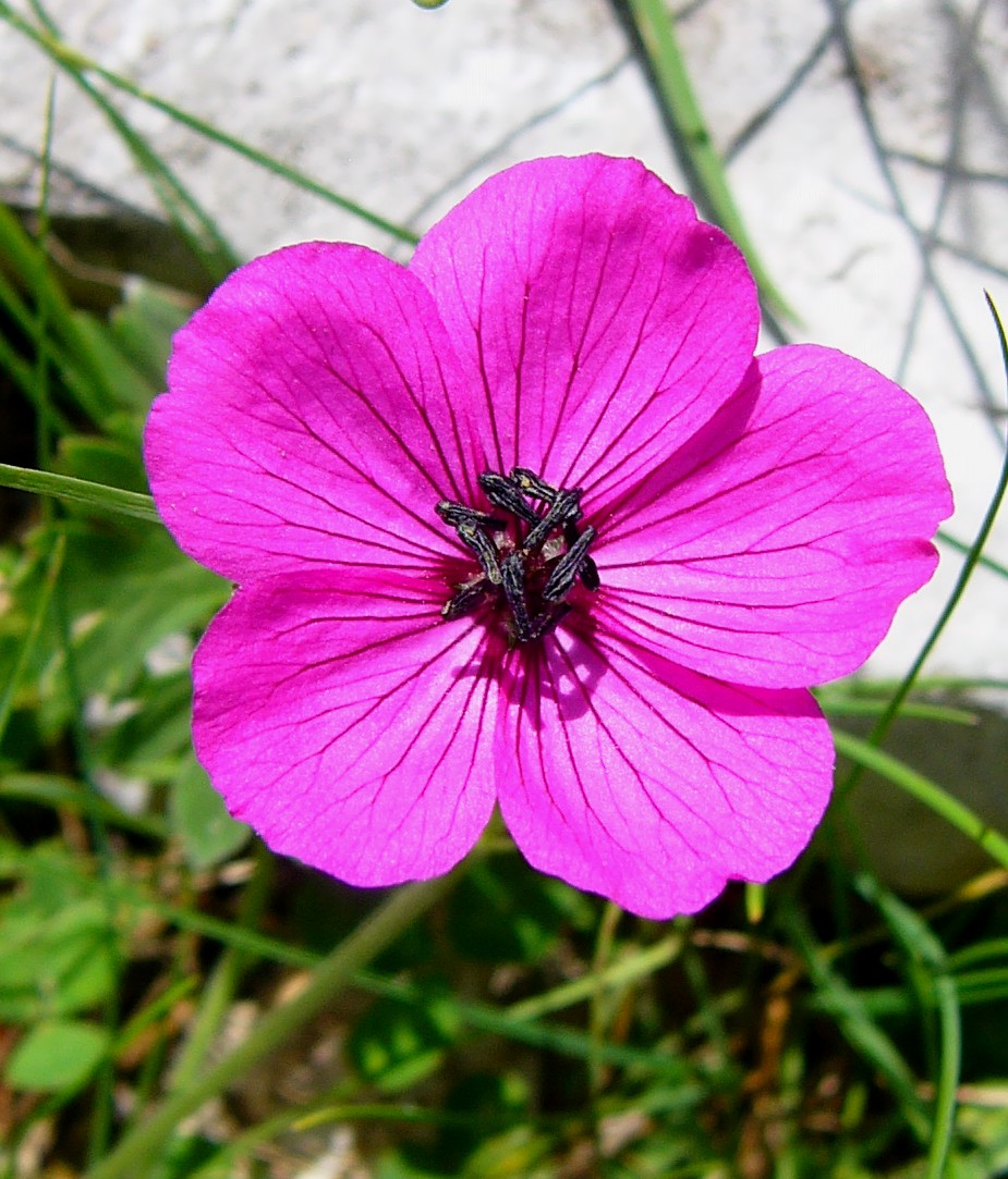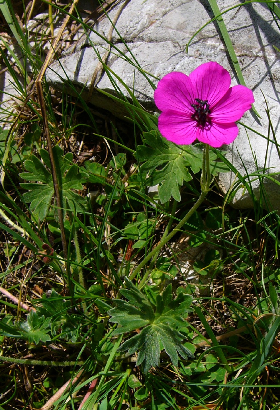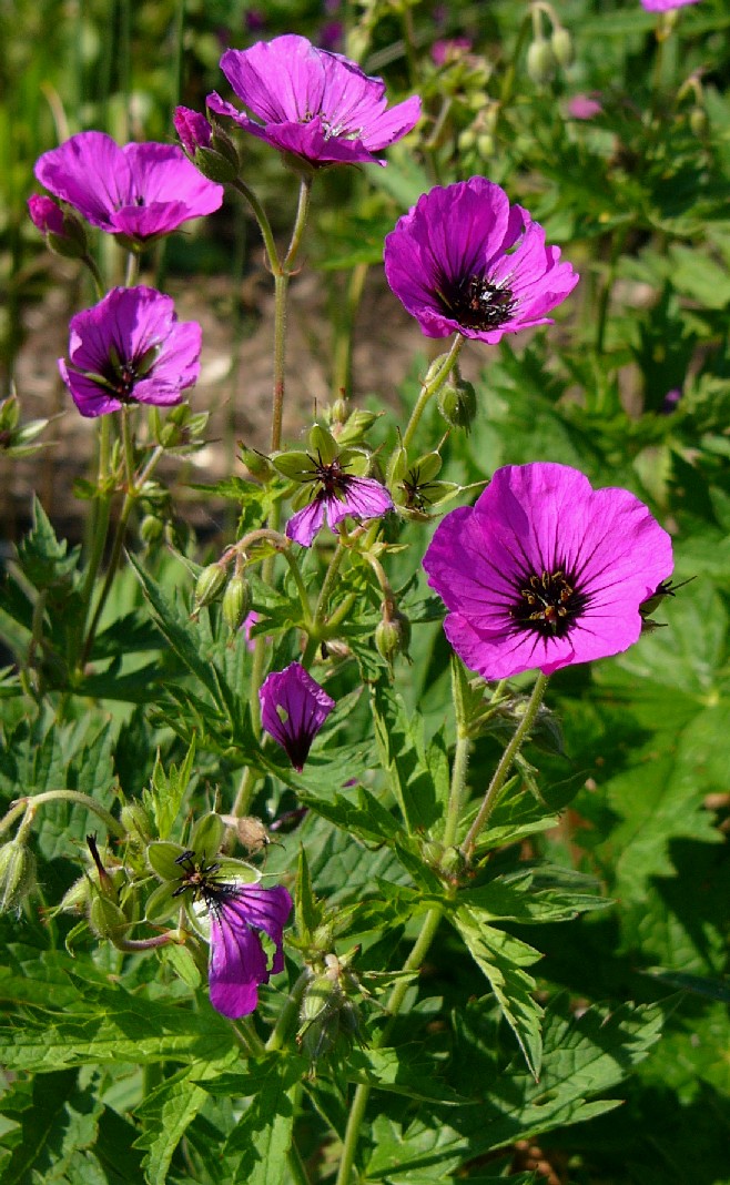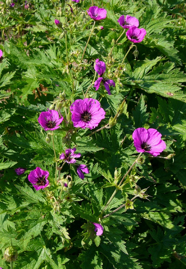 Geranium - Blüten groß, tiefpurpurn, mit schwarzem Zentrum, ausgebreitet, Staubblätter nicht aus der Blüte herausragend, Blätter gelappt, Teilblütenstände mit 2 Blüten