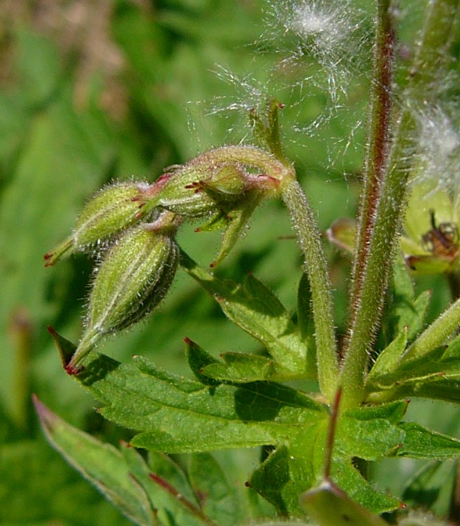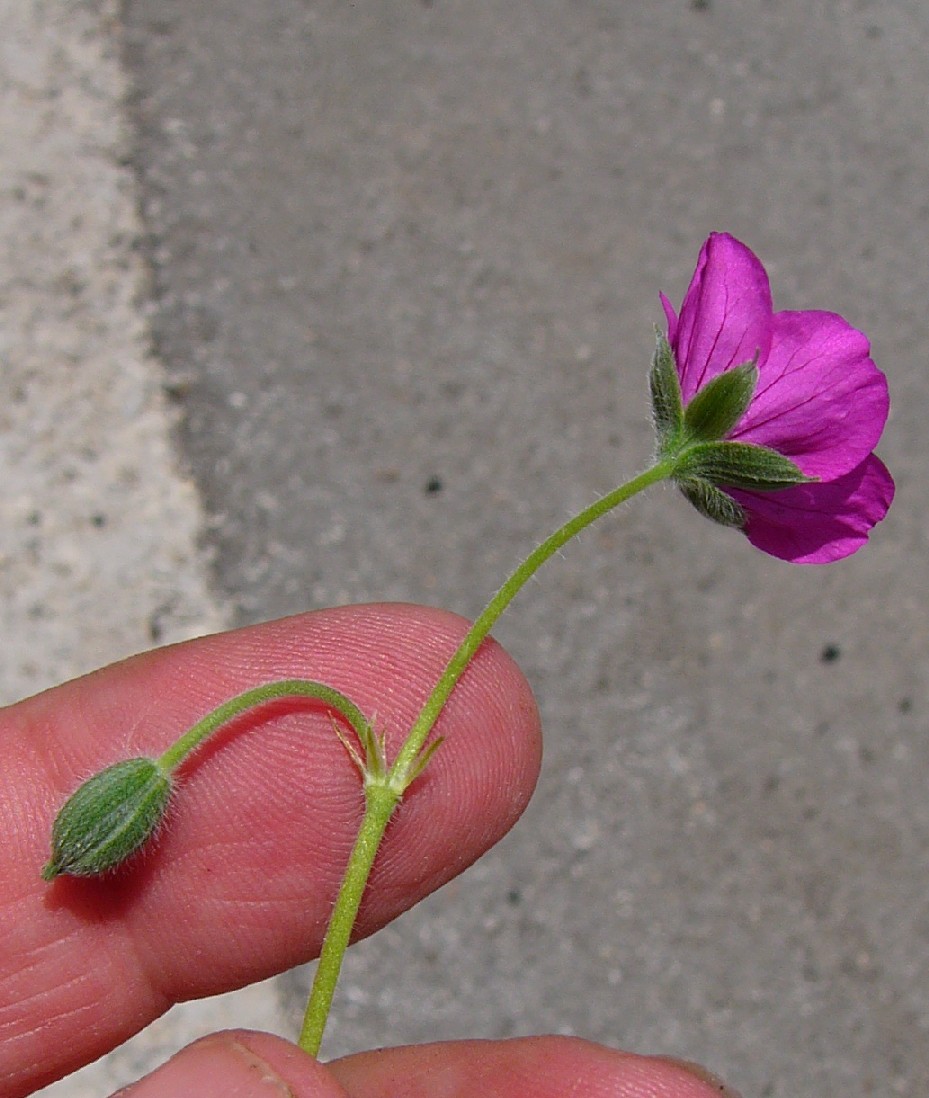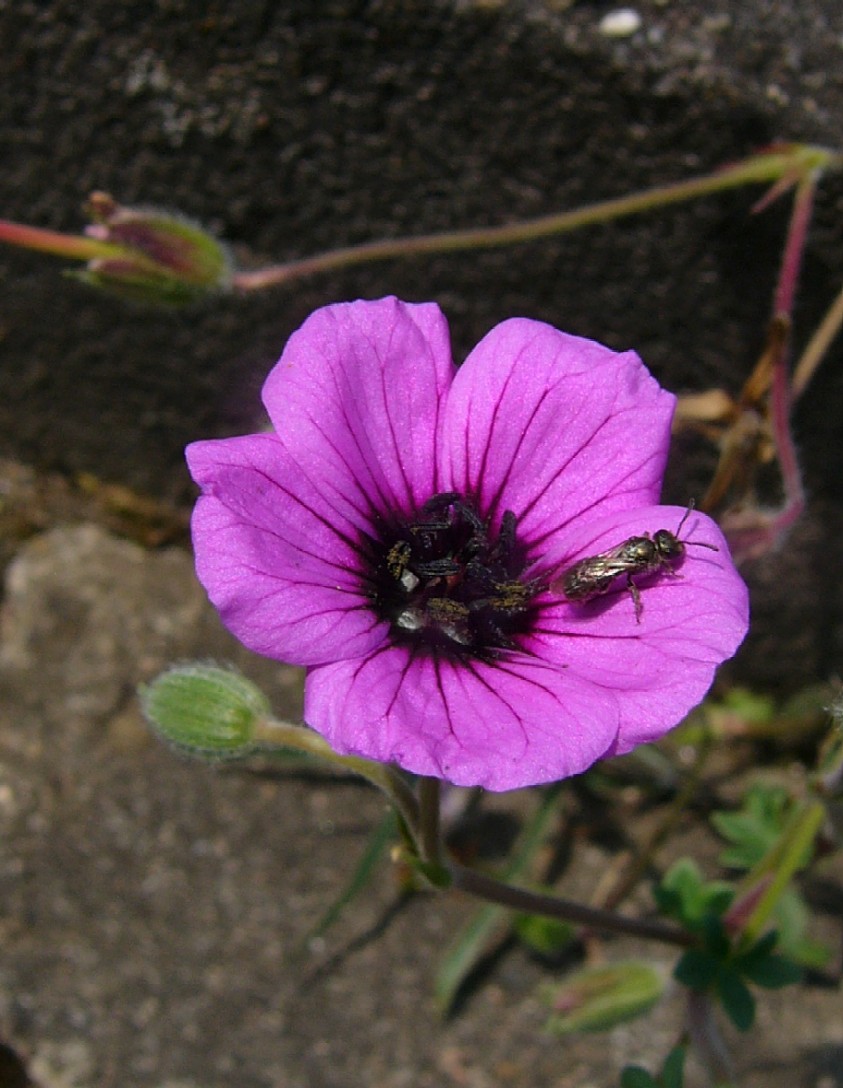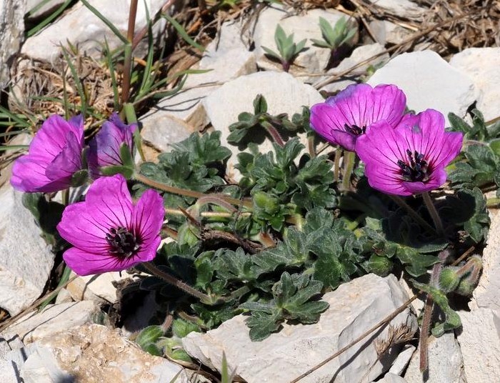 Geranium - Blüten groß, tiefpurpurn, mit schwarzem Zentrum, ausgebreitet, Staubblätter nicht aus der Blüte herausragend, Blätter gelappt, Teilblütenstände mit 2 Blüten