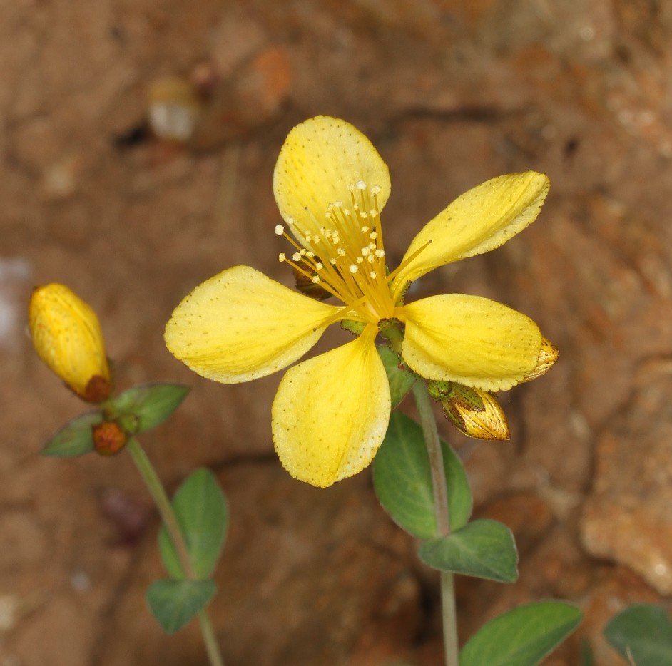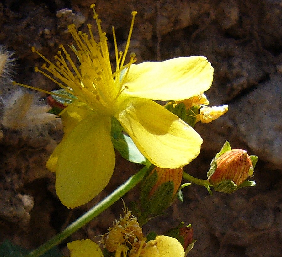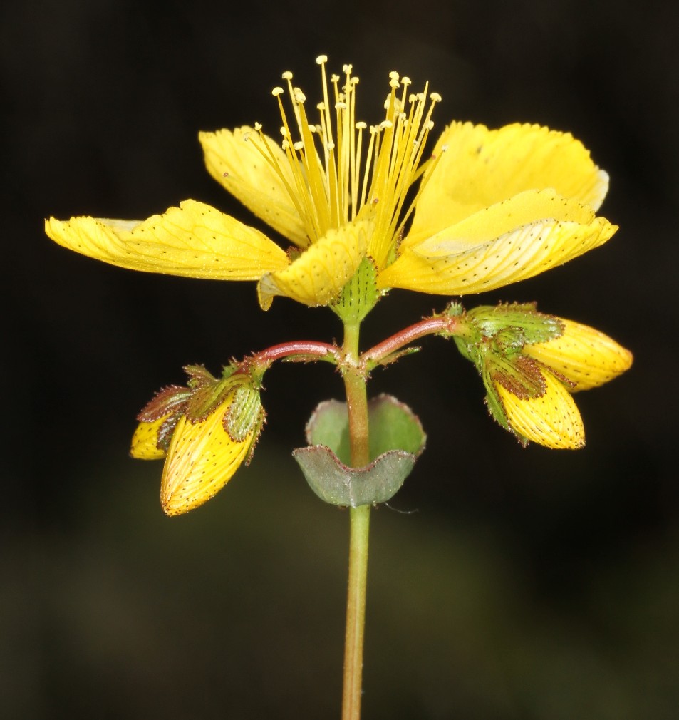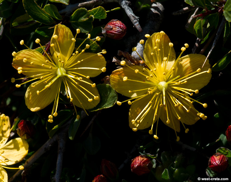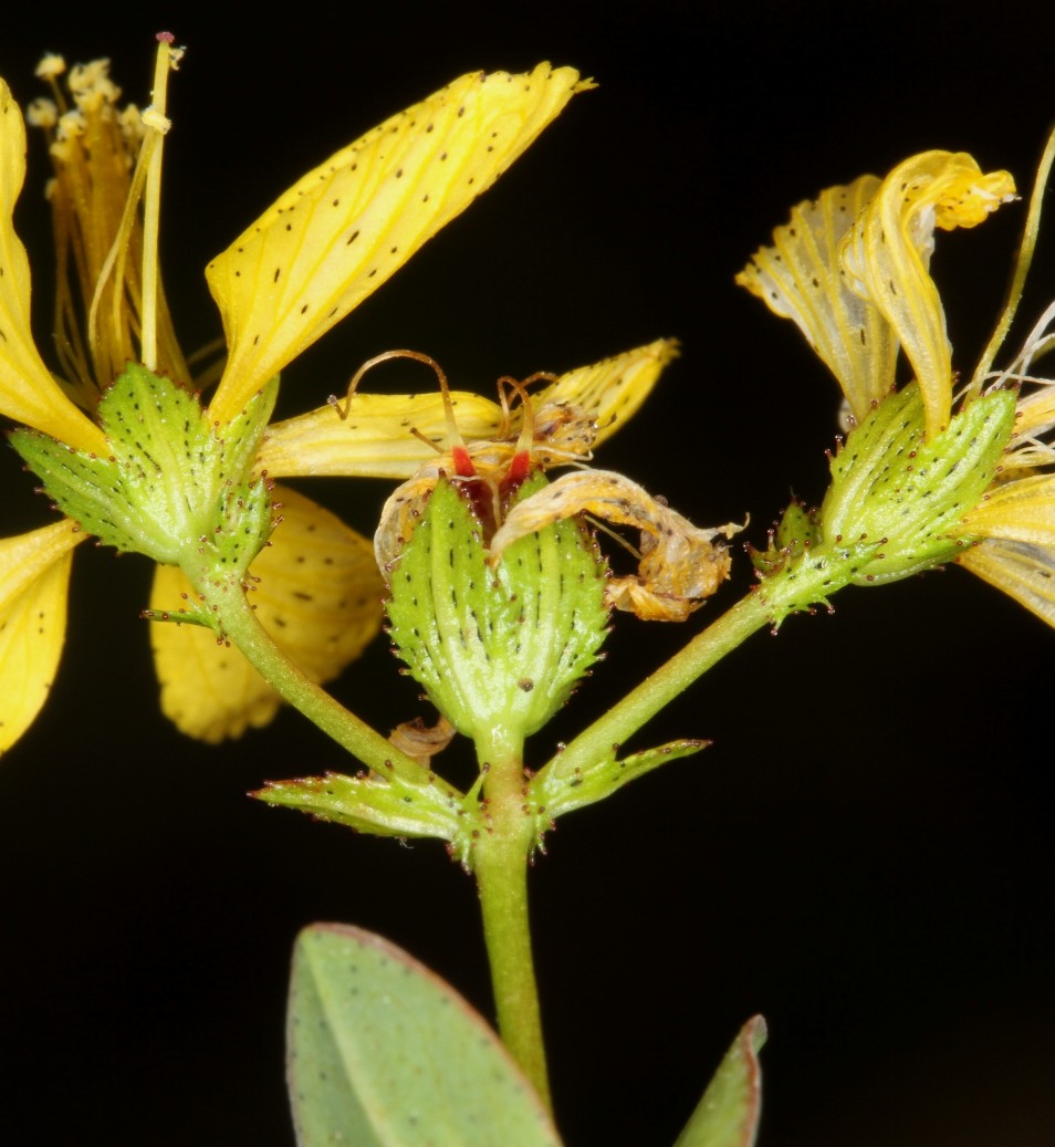 Blütenknospen gelb, Blüten gelb, 1 - 3 mm lang gestielt, 18 - 30 mm im Durchmesser, mit 5 Kronblättern, Kronblätter 9 - 15 mm lang, 3 - 6 mm breit, spatelförmig, mit schwarzen Punkten oberseits auf der Fläche und am Rand, 3 Griffel, 40 - 50 Staubblätter, Staubblätter 8 - 13 mm lang, Staubbeutel gelb