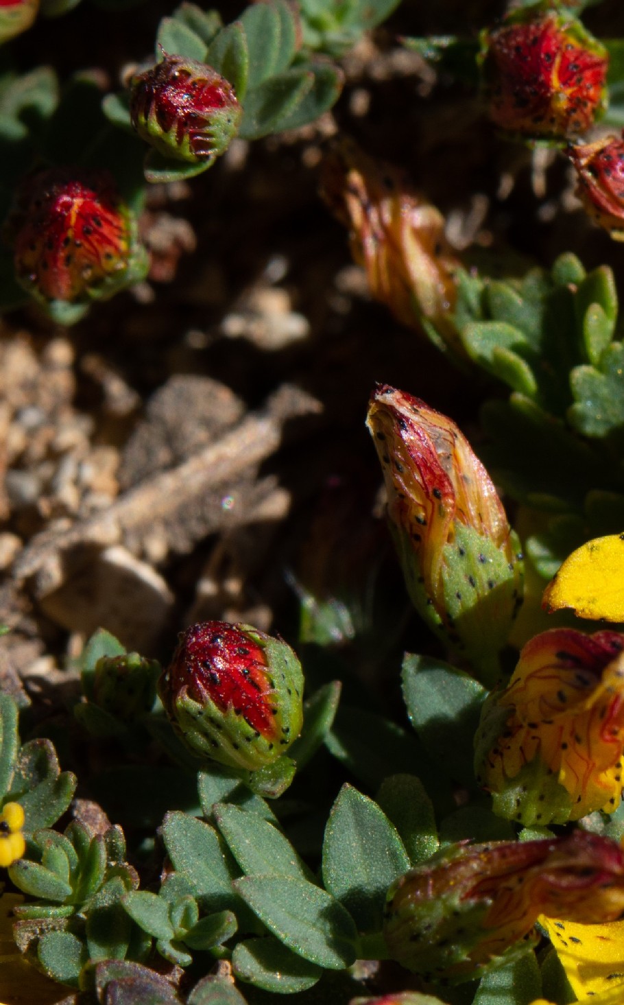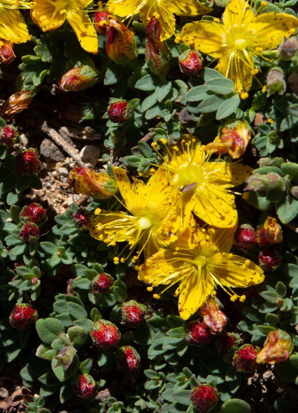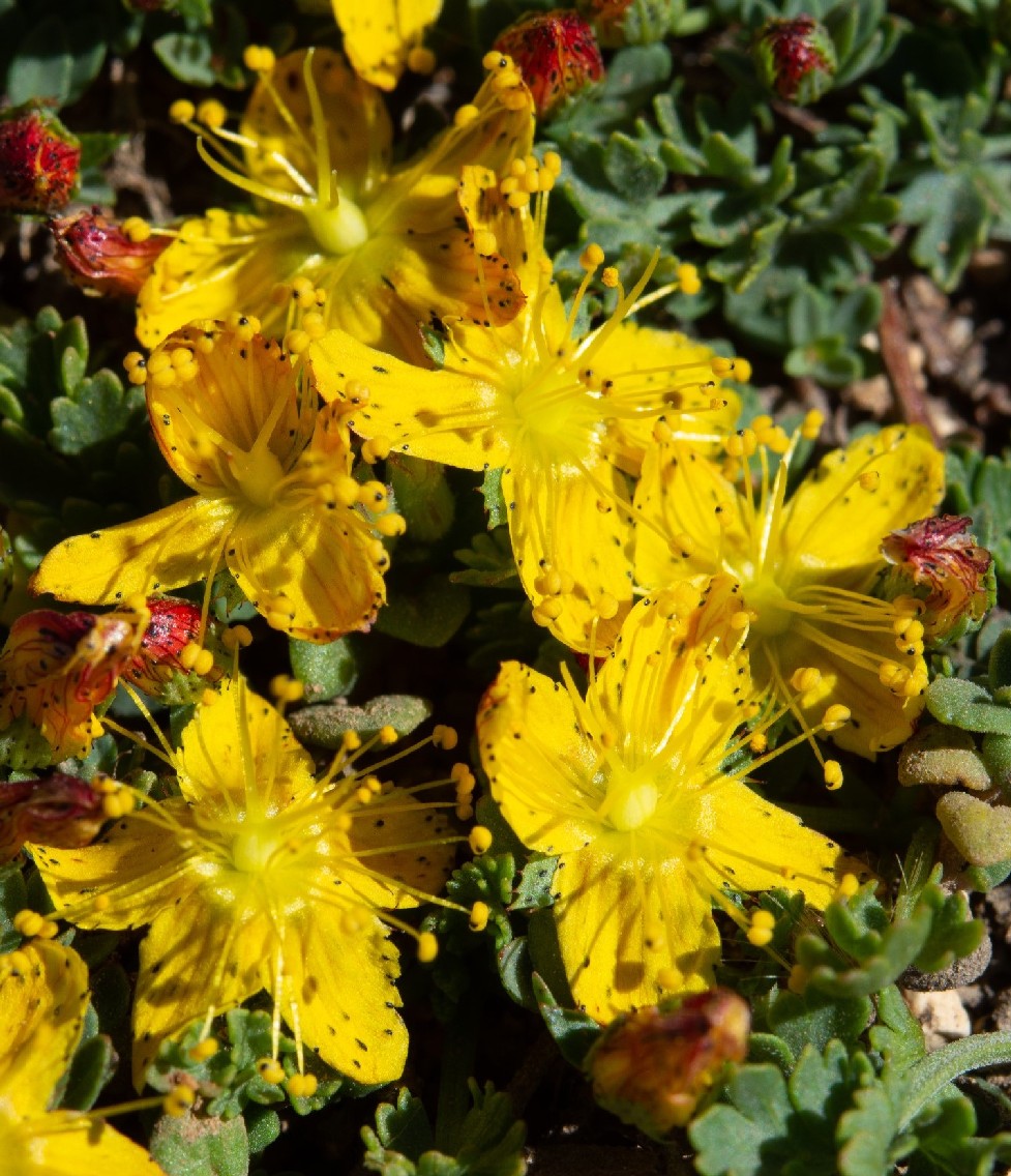 Blütenknospen gelb, Blüten gelb, 1 - 3 mm lang gestielt, 18 - 30 mm im Durchmesser, mit 5 Kronblättern, Kronblätter 9 - 15 mm lang, 3 - 6 mm breit, spatelförmig, mit schwarzen Punkten oberseits auf der Fläche und am Rand, 3 Griffel, 40 - 50 Staubblätter, Staubblätter 8 - 13 mm lang, Staubbeutel gelb