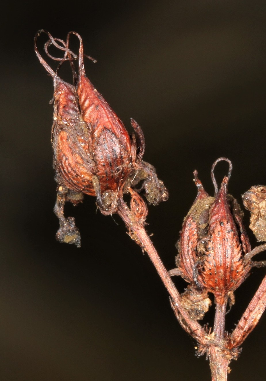 Kelchblätter am Grund kurz verwachsen, eilanzettlich, 3 - 5 mm lang, 2 mm breit, vorne spitz oder stumpf, mit kurz gestielten, rötlichen Drüsen am Rand, auf Fläche mit in 4 Reihen stehenden schwarzen Punkten