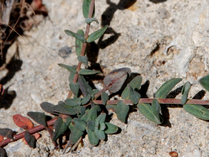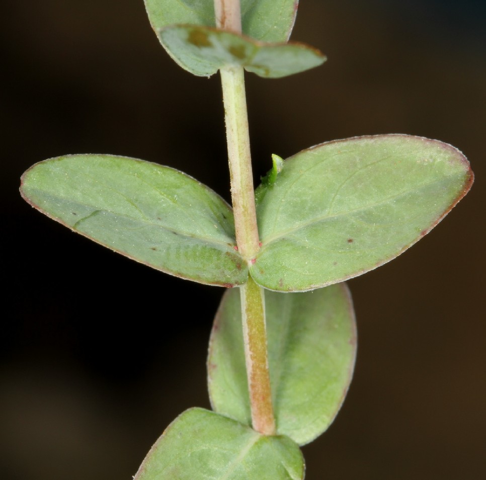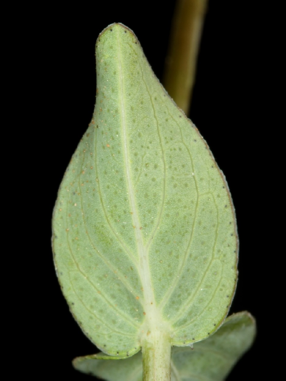 Blätter 8 - 18 mm lang, 3 - 7 mm breit, unterseits auf der Fläche mit einigen durchscheinenden Drüsen, am Rand mit einigen schwarzen Punkten, Tertiärnerven undeutlich