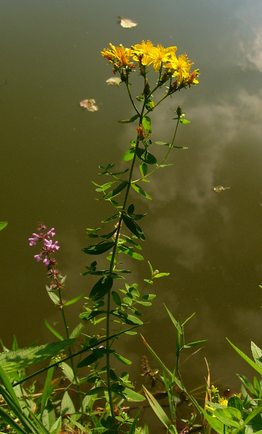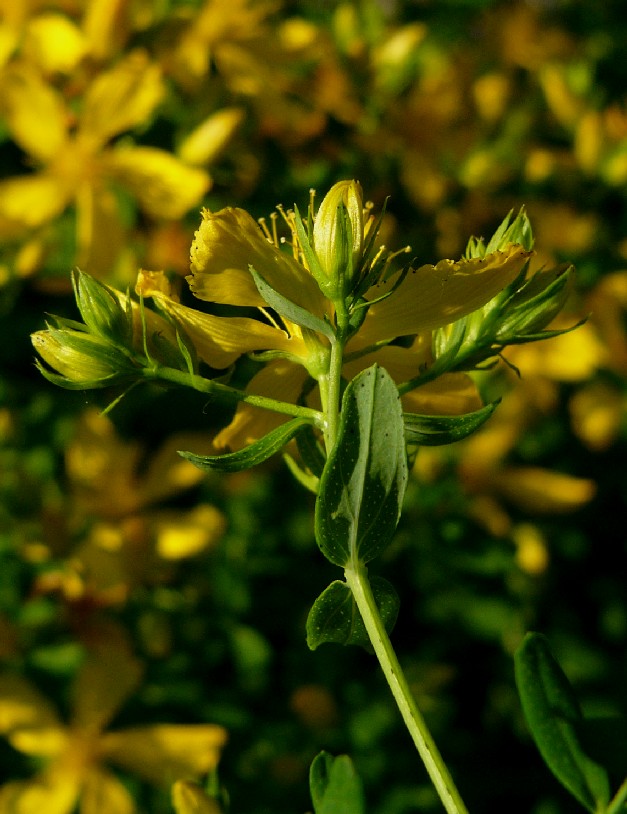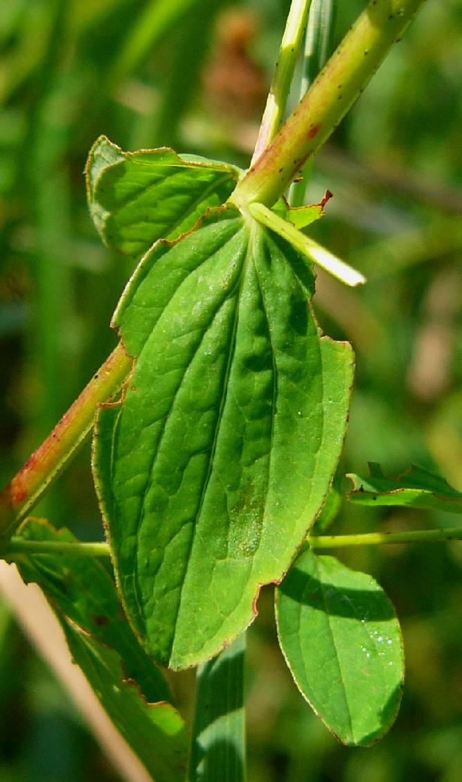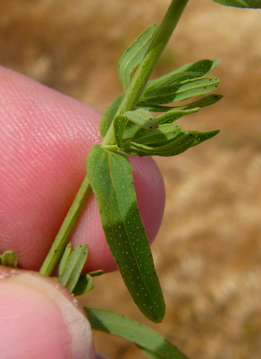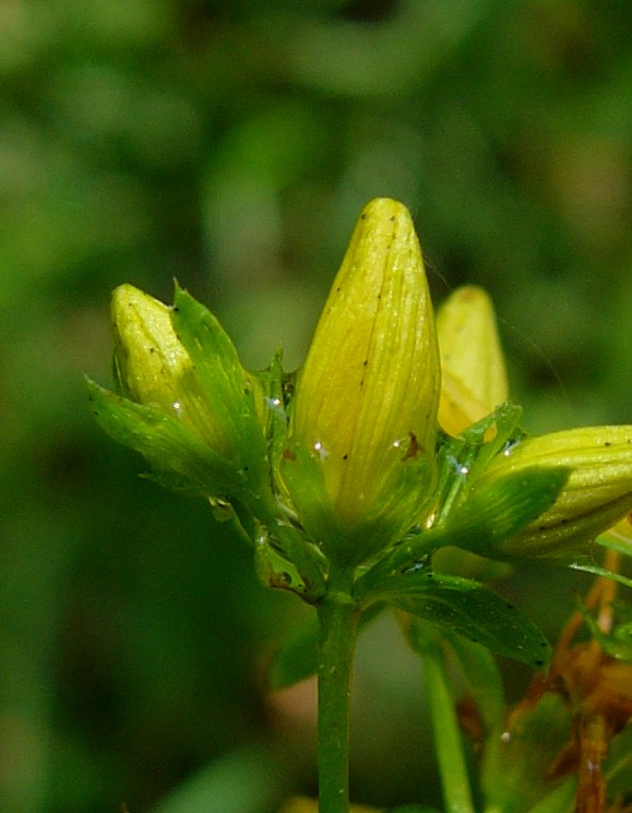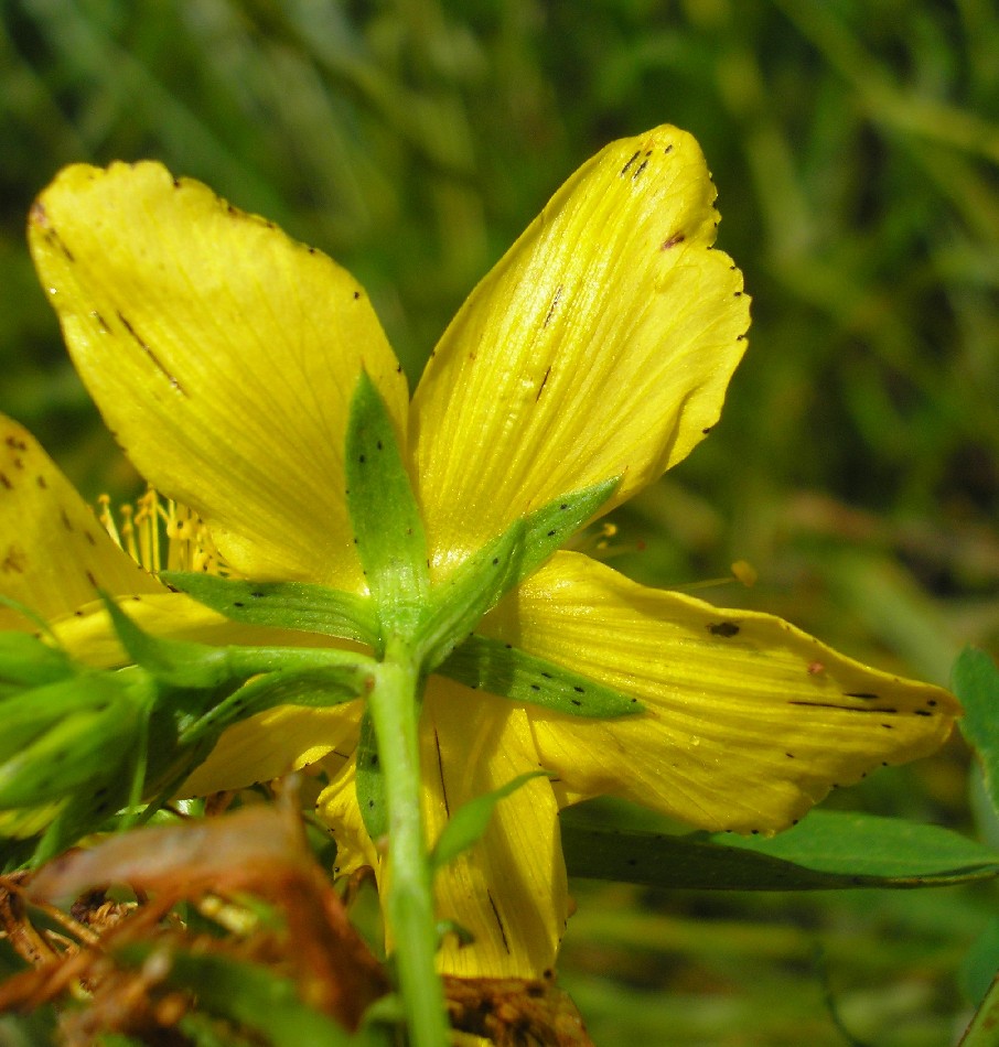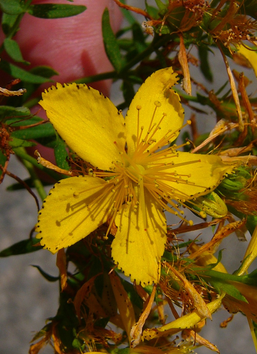 Hypericum - Pflanze aufrecht, kahl, wenig verzweigt, mit roten oder schwarzen Punkten/Drüsen, Kelchblätter ganzrandig oder mit sitzenden Drüsen, schmal, spitz, Blätter gegenständig, lanzettlich oder eiförmig, Staubbeutel gelb