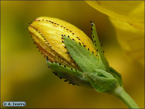 Krone gelb, Kronblätter 7 - 9 mm lang, oft mit schwarzen Punkten
