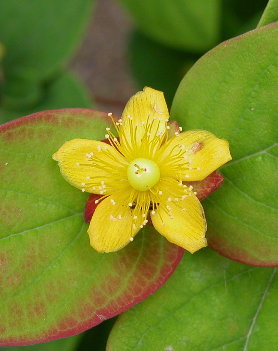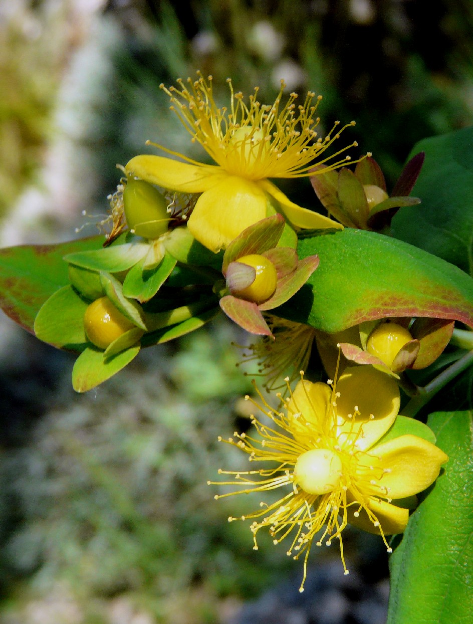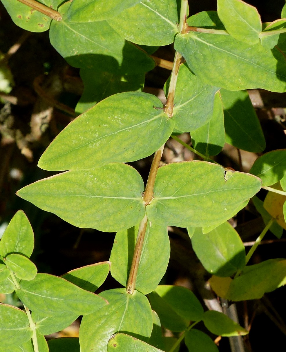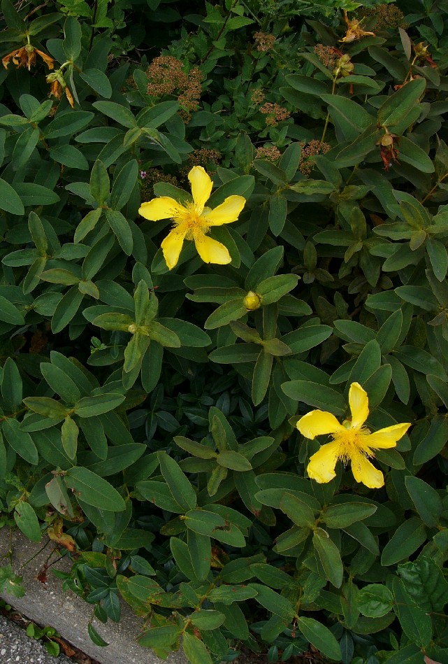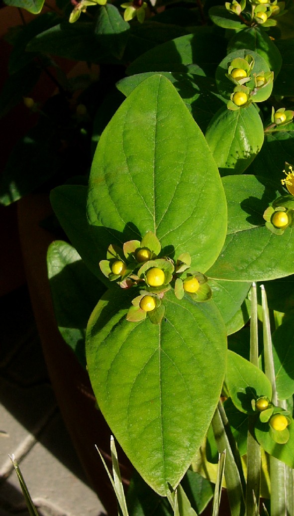Hypericum - Pflanze kahl, ohne schwarze Flecken oder Drüsen, Blätter gegenständig, groß