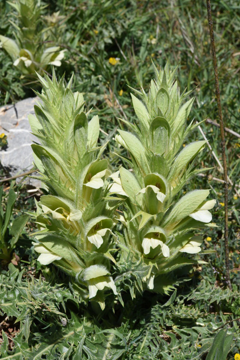Gattungsmerkmale: Blütenstand ährig, vielblütig, Krone besteht mit vorne 3- lappiger Kronunterlippe, Kronoberlippe fehlend oder stark reduziert, Kronröhre kurz, Kelch mit 4 Kelchblättern: 2 kleine innere, 1 großes, blattähnliches, oberes und 1 großes blattähnliches, unteres Kelchblatt, 4 Staubblätter, Antheren nur mit 1 Theke, 1 Griffel, 2 Narben, Kapsel elliptisch, 2- fächerig, mit 2 - 4 großen Samen, Blätter gegenständig und grundständig, gefiedert, fiederteilig oder gebuchtet, +/- bedornt, ohne Nebenblätter  |