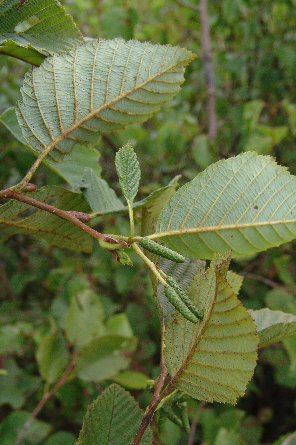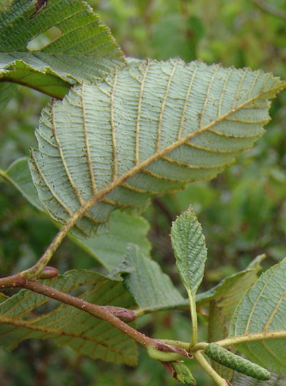 4 Sträucher oder bis 6 m hohe Bäume, Fruchtschuppen vorne ungleichmäßig gezähnt, Blattnerven unterseits rotbraun behaart