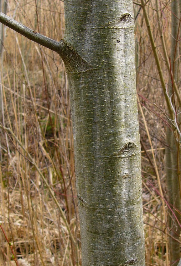 Rinde glatt, weißgrau, auch im Alter kaum aufreißend, mit Lentizellen