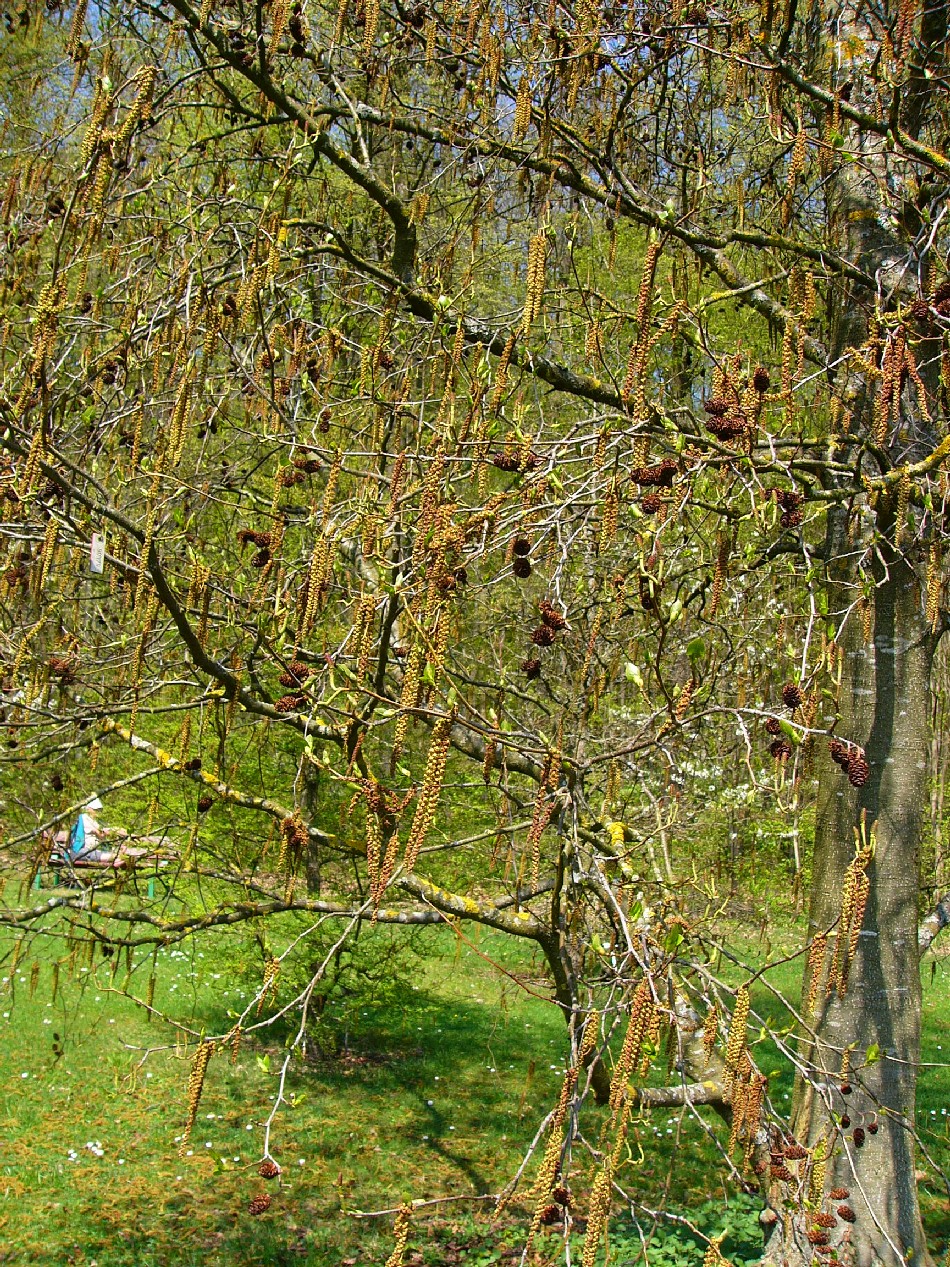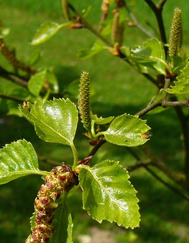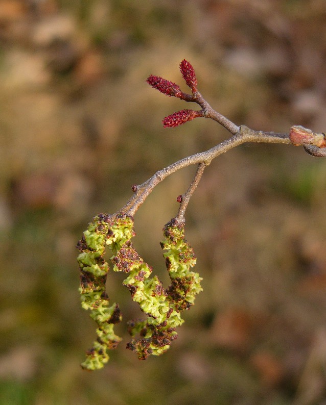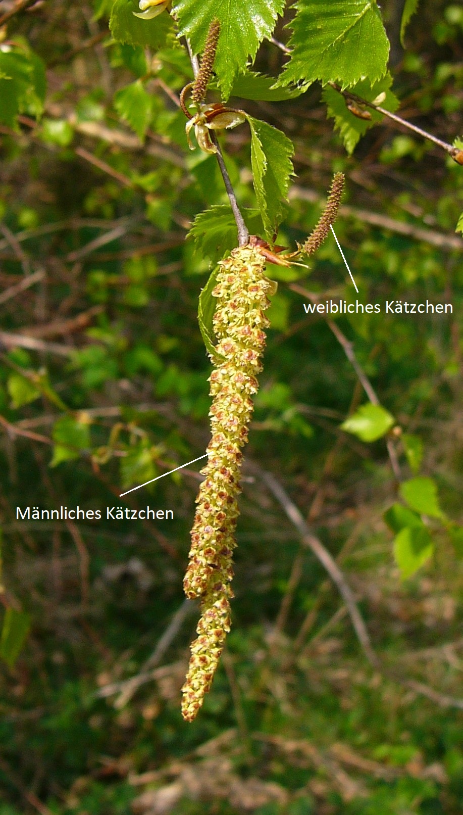 Pflanze einhäusig d.h. männliche (hier: gelblich, groß) und weibliche (hier: kleiner, grün) befinden sich auf einem Baum. Kätzchen mit dem Blattaustrieb erscheinend