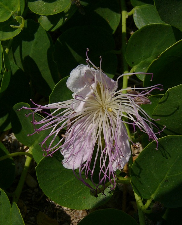 Blüten 4 - 5 cm im Durchmesser, mit 4 weißen oder hellvioletten Kronblättern, vielen Staubblättern und einem Fruchtknoten, der auf einem Gynophor aufsitzt