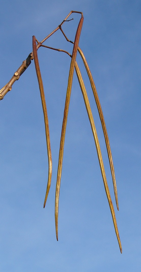 Im Frühjahr befinden sich die reifen Schoten noch auf dem Baum