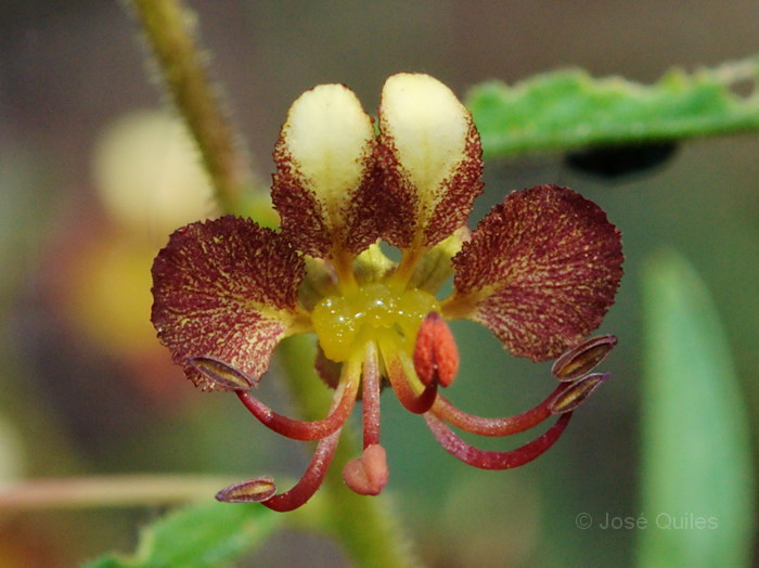 Blüten zygomorph, mit 4 Kronblättern, 4 Kelchblättern, 6 Staubblätter und 1 langem