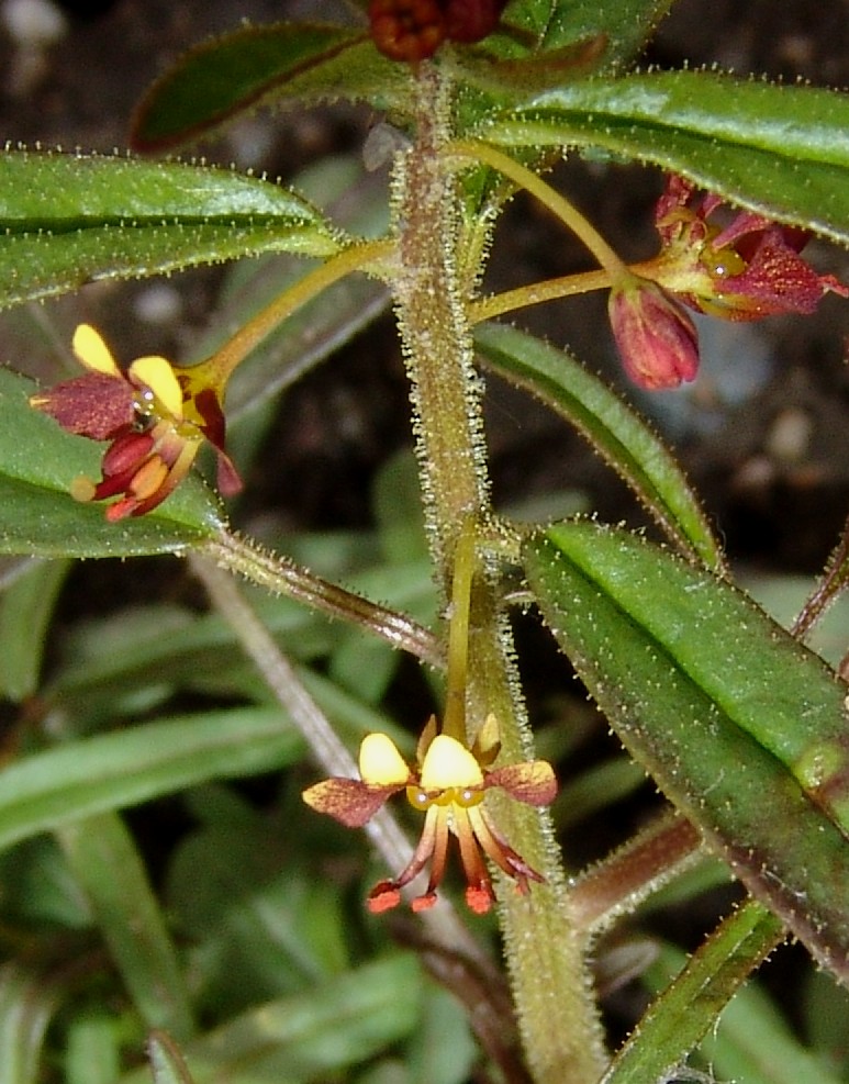 1 Blüten rotbraun/gelb, Brakteen länger als die Blütenstiele, Schoten nicht eingeschnürt